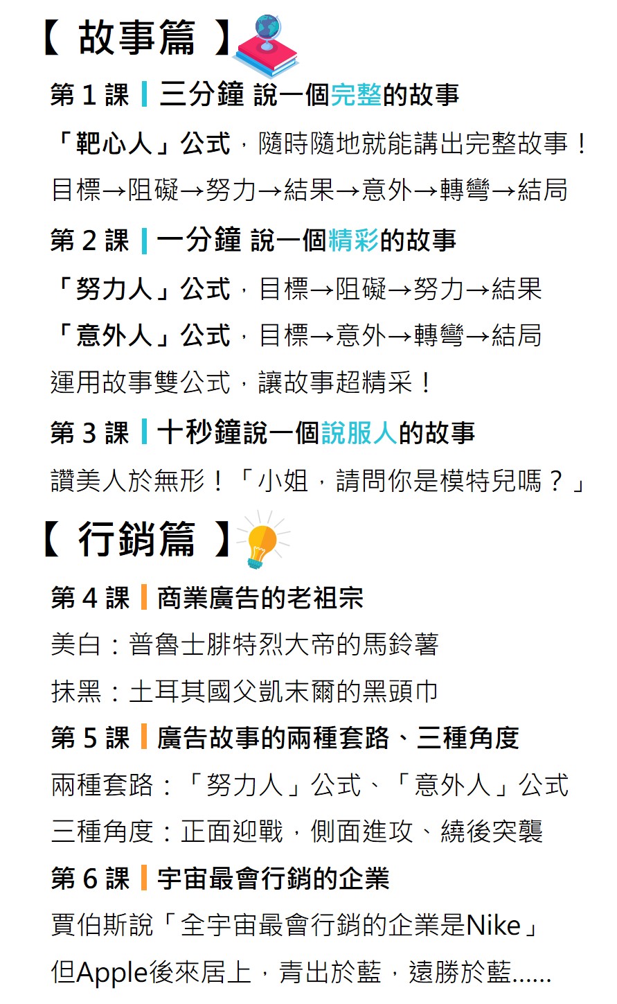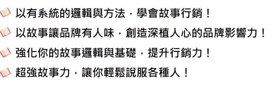 而故事行銷的手法經典不敗,在內容當道的現在更成為行銷顯學,企業品牌開始重視並運用故事行銷傳遞品牌精神與理念,希望在過於同質與透明的競爭市場中為自己創造一點不同,讓品牌走進顧客心中,留下深刻記憶,更要用故事讓商品熱賣!然而,故事的力量不僅止於此,你更可透過引人入勝的故事,創造高說服力,與溝通對象產生共鳴與連結,滲透人心,達成目的!