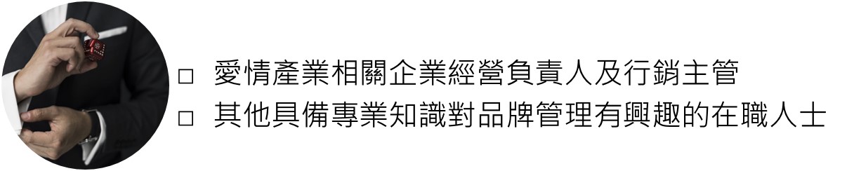 各種情人節商機、約會、婚紗、妝髮、婚宴、攝影、住宿、餐飲以及情趣,各種與「愛情」緊密相連的行業,形成一年擁有破千億元商機的愛情產業鏈。而面對潮流趨勢的轉變,少子化與數位時代來臨,讓各種行業紛紛開始思考如何因應與發展出新的商機與服務。而如何提升自己的品牌高度與打造創新獲利商業模式、怎麼跟異業結盟合作,共創獲利機會,都是本課程的重點。
