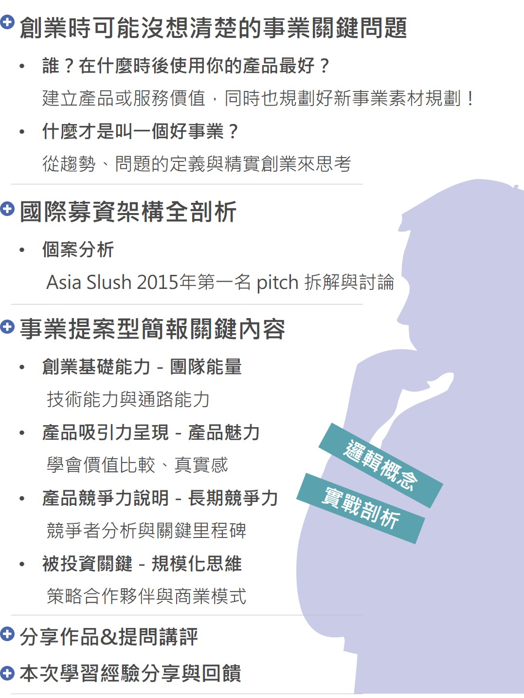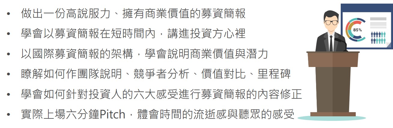 本次課程,邀請到知名新創導師孫治華,以多年的企業管理與輔導經驗,帶我們從國際募資簡報架構起頭,學會如何說明團隊、產品,以及商業價值與潛力、如何將效益數據化,更將了解投資方在意是什麼,讓你順利募得事業資金,每個投資方都被你說服!