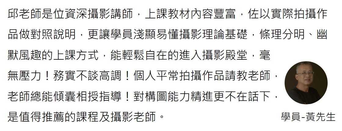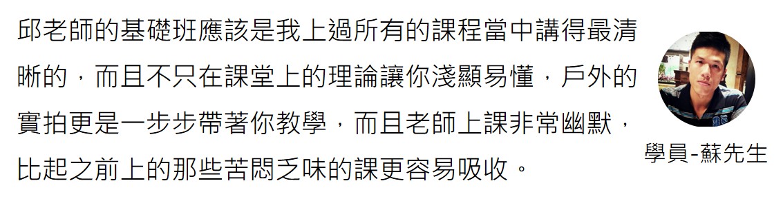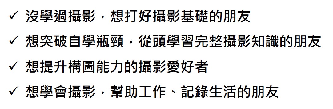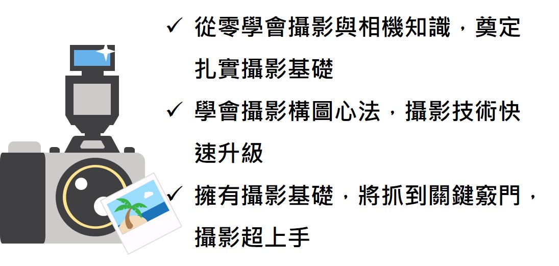本次課程,將由資深攝影名師邱泓璋老師,從零開始教授相機的基礎操作與八大構圖心法,深入淺出,帶我們開啟攝影眼,學會找到美的事物。更將以淺顯易懂的方式讓我們認識相機最重要的光圈、快門、ISO三要素、景深、白平衡與對焦,並掌握拍攝技巧,快速帶你奠下扎實的攝影基礎,不只學會解析照片之美,更能學會拍出一張張具深度、與眾不同的動人照片!