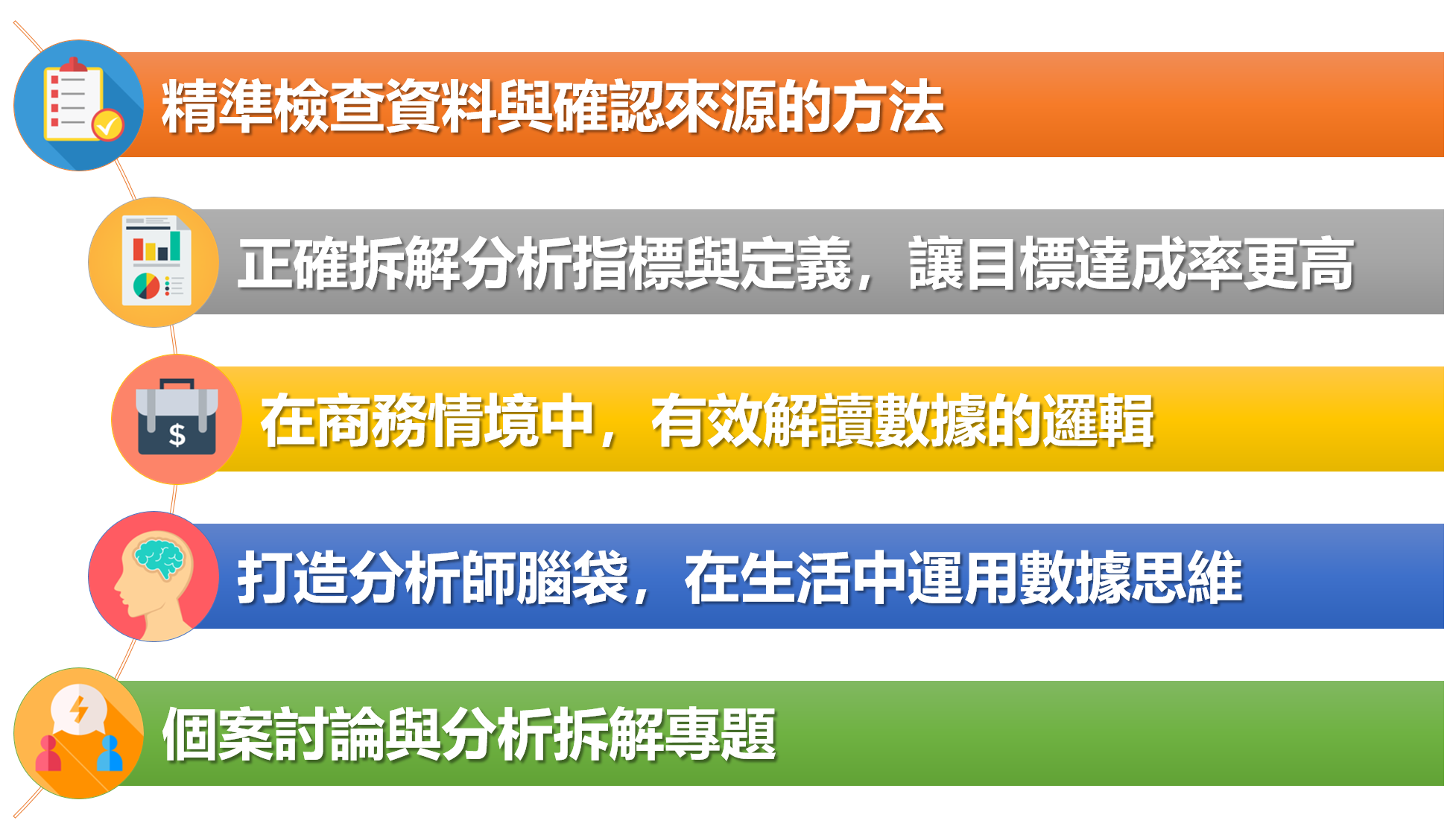 數據思維,有被譽為未來「企業管理的第一思維」之說,或許你已常耳聞大數據、人工智慧……等與數據相關的熱門議題,可是覺得有點遙遠。但其實數據分析的技巧不只能泛用於不同領域、實際上更能通用於不同職業,不管你在近年火熱的網路服務與電子商務產業,或是在餐飲、媒體、傳產或任何領域服務,甚至不論你在其中是行銷、商務、營運,都需要和各種數據打交道。