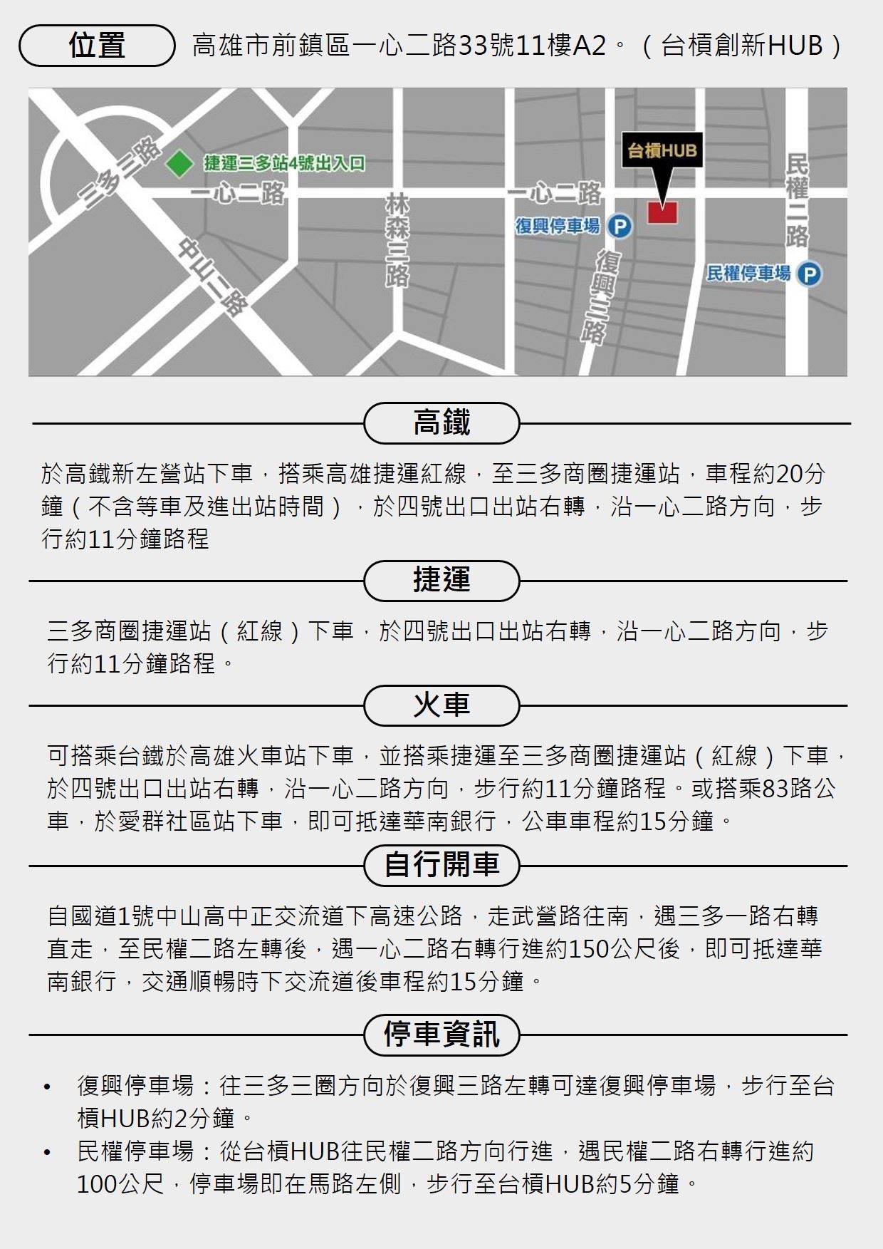 - 位置:高雄市前鎮區一心二路33號11樓A2。(台槓創新HUB)