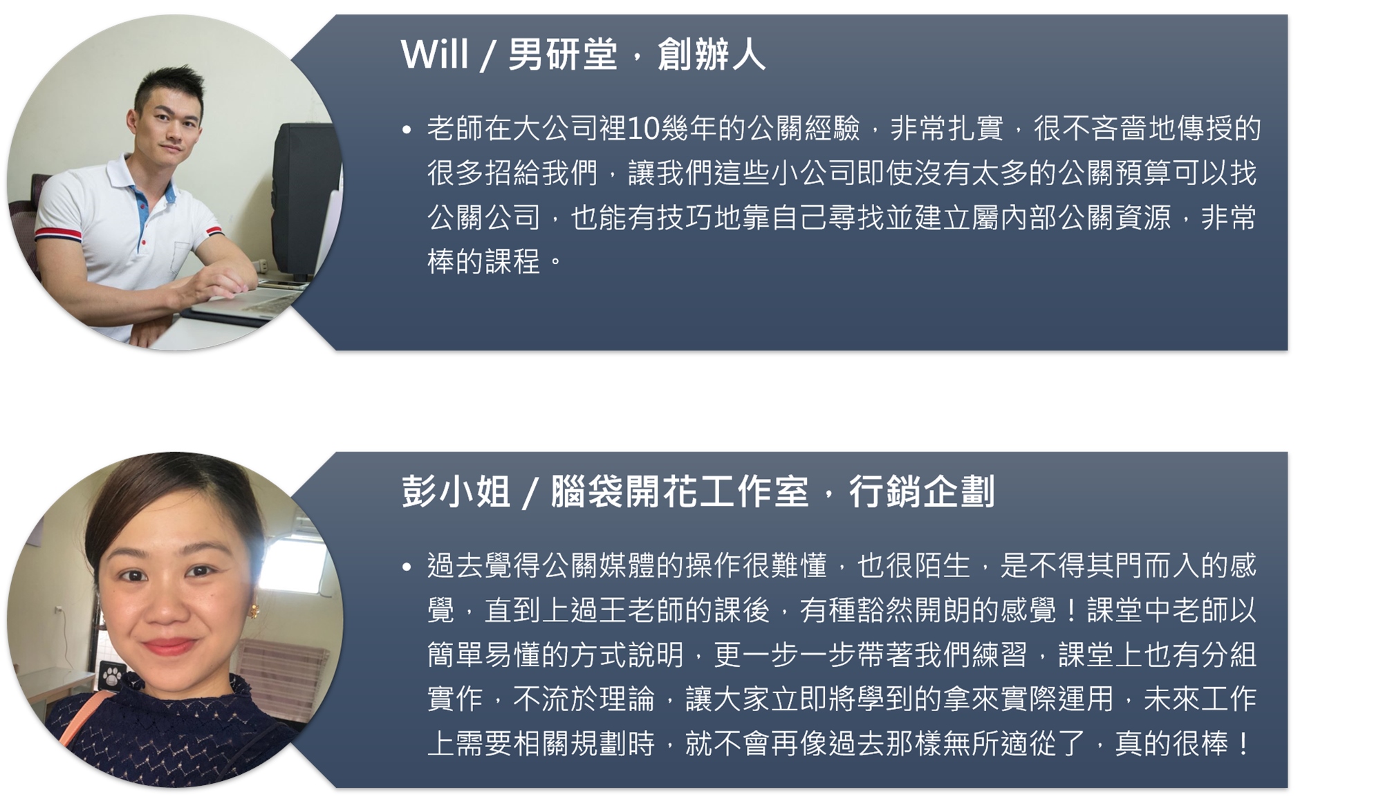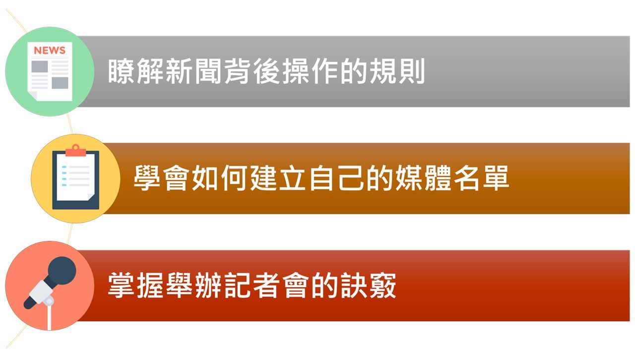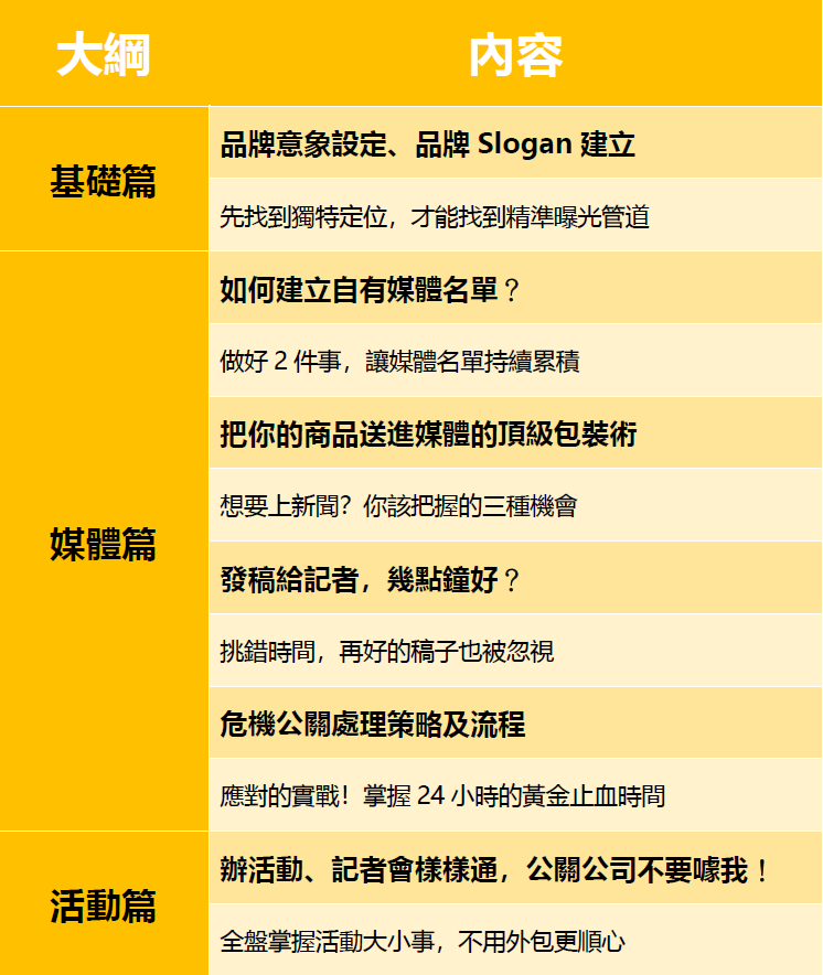 本次課程,邀請到從事企業公關工作長達15年,人稱「公關溫拿」的王蜜穜老師,指導大家如何認識記者建立媒體人脈,讓新聞稿順利被採納,以及快速應對品牌公關危機,另外若想自辦活動/記者會衝刺媒體聲量,王老師也將教你如何做出最高曝光。