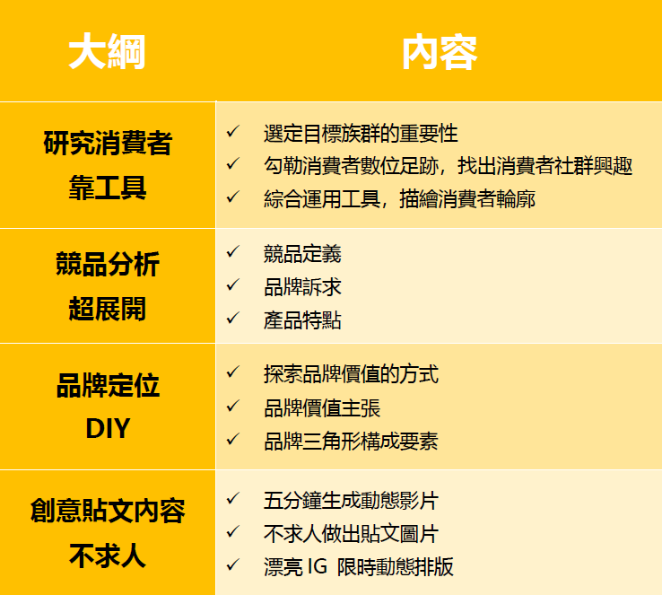 本次課程,邀請到SoWork 小編神器創辦人,前奧美互動行銷副總經理的王俊人老師(CJ Wang),前來分享他投入數百個小時,研究國內外各項社群行銷工具後找到的小編神器系列,不僅能用來分析消費者、研究競爭品牌、找出品牌核心價值,還能快速做圖、做影片、做IG限時動態,讓你從此學會以科技取代人力,不僅效率提升,專業度也會一起飆升!