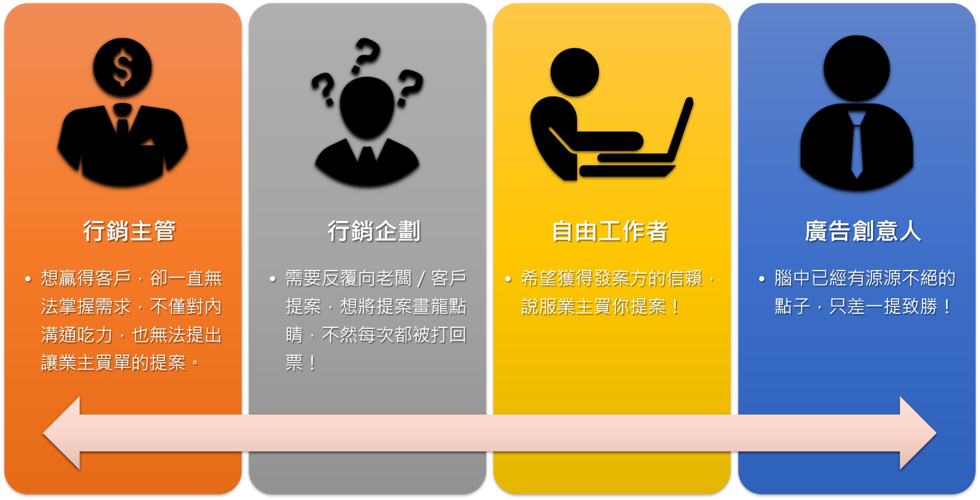 本次課程,邀請到現任 SoWork小編神器創辦人/前奧美互動行銷副總經理CJ(王俊人) 前來,將他在4A 廣告公司到自己創業期間1000多個不同產業、不同命題、不同解法的提案經驗,精煉成20分鐘的提案心法,教授他親自實戰過成功率高達9成的提案模組,並透過實戰演練,讓你提案功力大增,目標就要讓你「一提就中」!