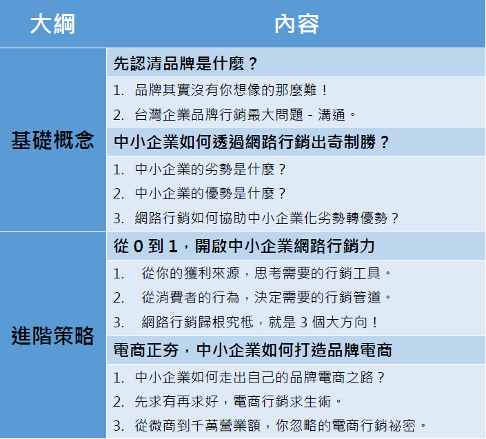- 學會如何透過數位行銷提昇企業品牌形象與價值