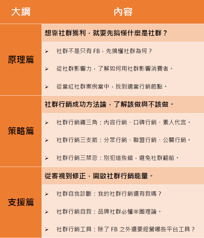 本次課程,「行銷武士」許小嚕老師,將告訴你社群該如何建立,從觀念到方法,帶你釐清社群行銷有效/無效的主要原因!當學會從玩社群到經營社群,你將有機會在短時間內創造出驚人的傳播效益,讓商品獲得更大的行銷能量與銷量。