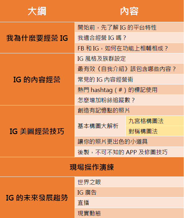 本次課程,邀請到擁有10萬Instagram粉絲追蹤的人氣網紅「冒牌生」,從最基礎開始,教你一步步打造你的Instagram,從如何玩社群的經營術,到最吸睛的美圖技巧,讓你不論是個人事業或品牌行銷,人氣都將成為上行業的新先驅。