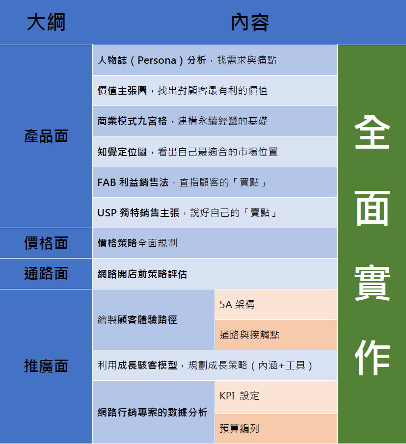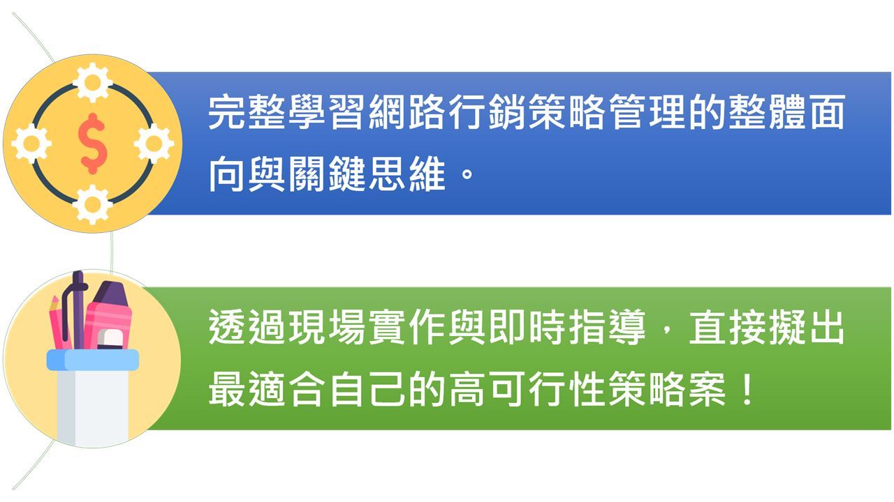 一個完善的網路行銷策略,不僅能幫你贏過競爭對手,更能為公司帶來可觀的獲利。有鑑於時下許多公司都缺乏有經驗的網路行銷人員,而台灣對在行銷人才上更是供不應求。本次課程,將邀請連啓佑老師以網路從業17年的經驗,開辦長達12小時的【網路行銷策略管理】規劃實戰工作坊教練班,以12人精緻小班,親身下場指導學員如何規劃與管理網路行銷策略。