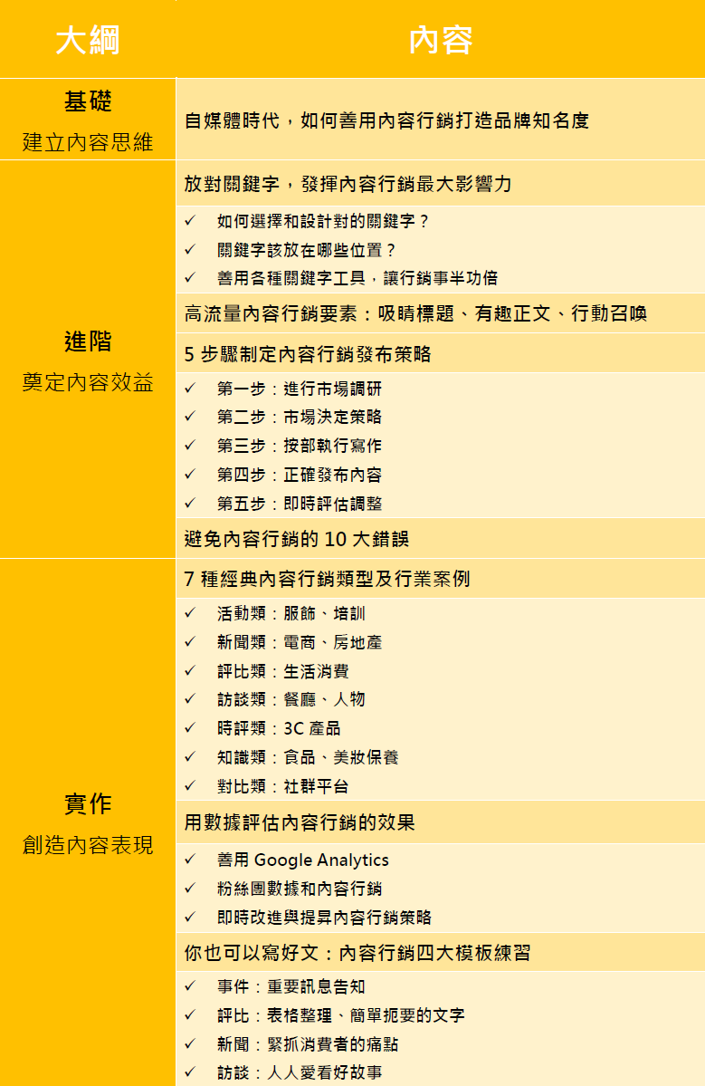 這次課程,我們邀請到跨足10大產業的資深媒體人張瑋容老師,以11年寫作採訪編輯經驗,引領大家逐步分析內容行銷的要素、策略、步驟、及技巧,從創意發想、寫文執行、行銷策略和資源整合四個角度,讓寫出來的內容一點都不像廣告,精準掌握內容行銷精髓,成為企業的內容行銷操盤手!