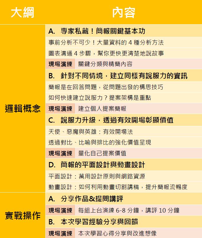 出色的簡報技巧並非天生,而是要經過學習、演練、調整而持續精進。本次課程,我們特邀請到曾透過簡報提案爭取到破千萬預算的「簡報實驗室」創辦人孫治華,帶大家從邏輯架構起頭,學會如何分析整理資料,並設計強力開場,從無到有做出一份充滿說服力與的簡報,從此每個案子都順利搶下,每個主管都被你說服!