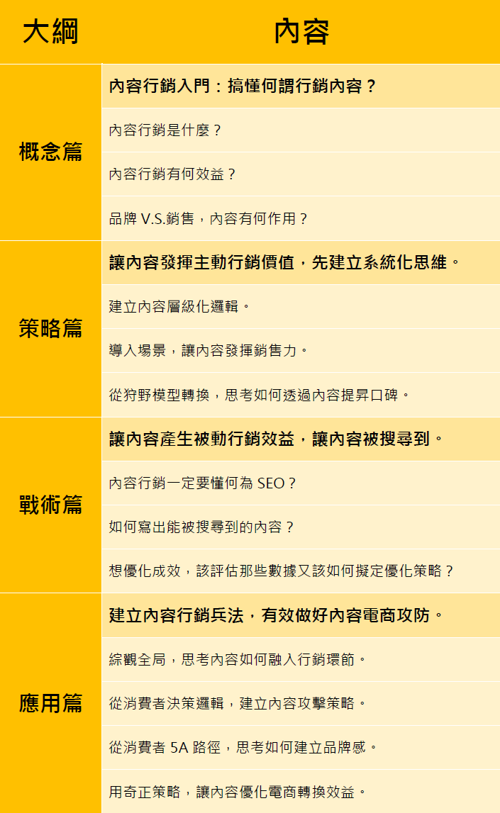本次課程,「行銷武士」許小嚕老師,將告訴你如何全面確經營內容行銷,並實際融入電商經營學,讓績效再提升一個水位,擺脫「只能燒錢無法獲利」的壓力,進而傳遞品牌價值,煉出死忠粉絲。