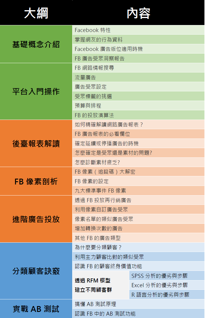 本次課程,邀請到活躍於兩岸三地網路圈的資深顧問-謝章升,將透過18小時的入門、進階、高段三堂課程,專注帶您從全盤掌握Facebook廣告特性與投放要領,您將可在課堂上直接以自家商品為標的,了解如何透過廣告後台工具洞察並優化成效,還可透過「Facebook像素」工具,對過路客進行再行銷刺激購買轉換,最後還能精準找出高潛力的陌生顧客,並藉AB測試找出這群客人最愛看的廣告,讓廣告效益精準放大,掌握高廣告投資報酬!