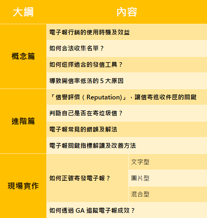 本次課程,我們邀請到台灣最大,國內超過10,000家企業使用的電子報服務「電子豹」的創辦人張國基,與大家分享從名單收集、追蹤、到分析消費者收到電子報後行為,並且找出優化方向……等一系列的Email電子報行銷攻略,搭配實際案例解析,幫助行銷效益更上一層,業績成長超有感!