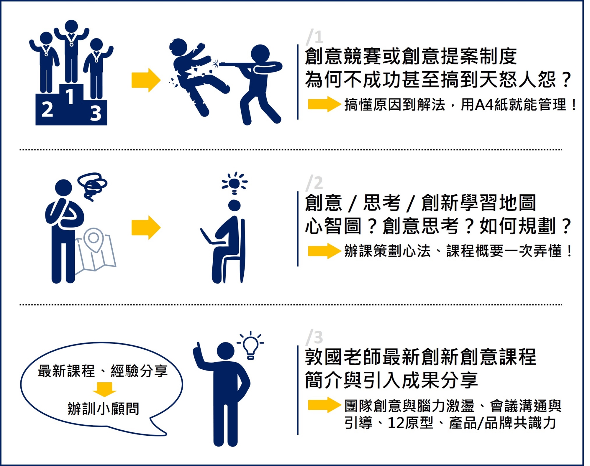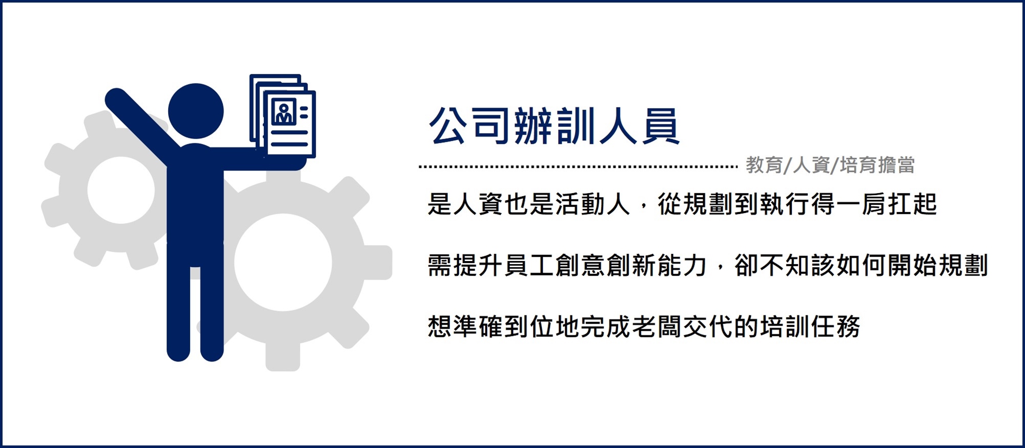 本次活動,專為需要辦訓、提升員工創造力的您,邀請到人生創意引導公司創辦人符敦國老師,將與您分享多年來主辦創意/創新課程活動的甘苦陷阱與辦訓撇步,滿是乾貨、經驗訣竅,讓你快速掌握企業搞創意的精髓,之後要規劃、辦課絕對不是問題!