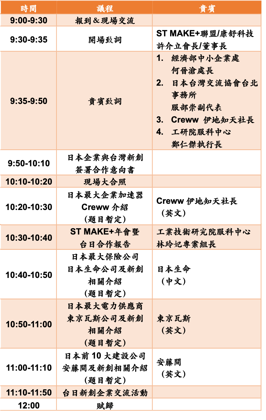 此外我們將在此年會邀請來賓一起見證去年「台日新創企業交流計畫」促成之日本企業及台灣新創進行合作意向書簽署,分享台日新創企業跨國合作成功的喜悅及經驗。