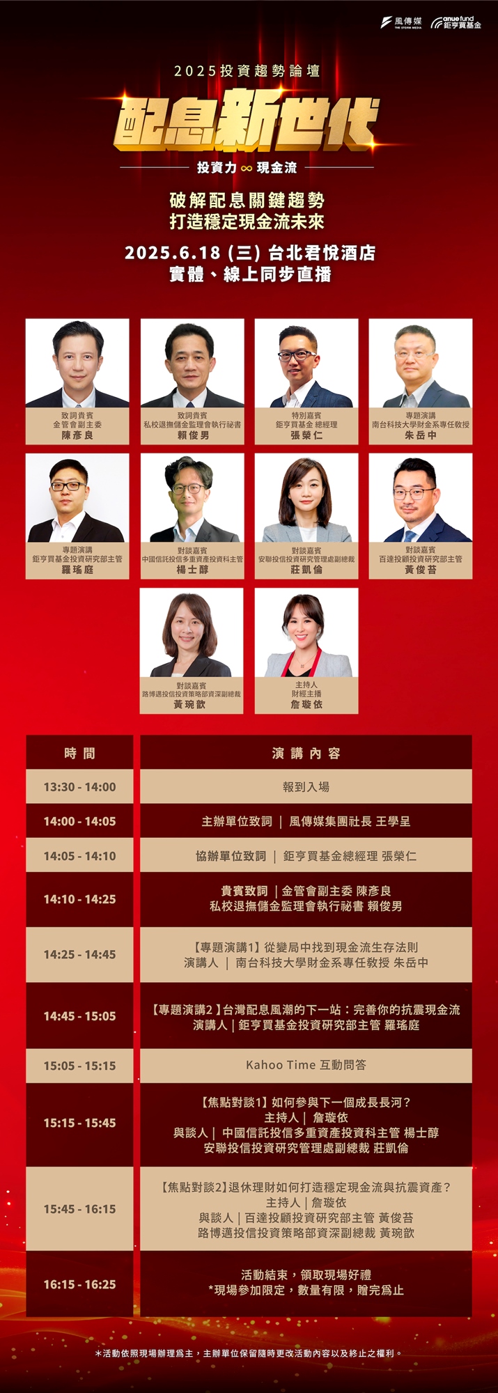風傳媒攜手產官學界多位重量級講者,從總經大局、資產風險、AI科技與永續投資等熱門議題切入,幫助你在風險升溫的環境中找出更聰明、更長遠的投資方向!