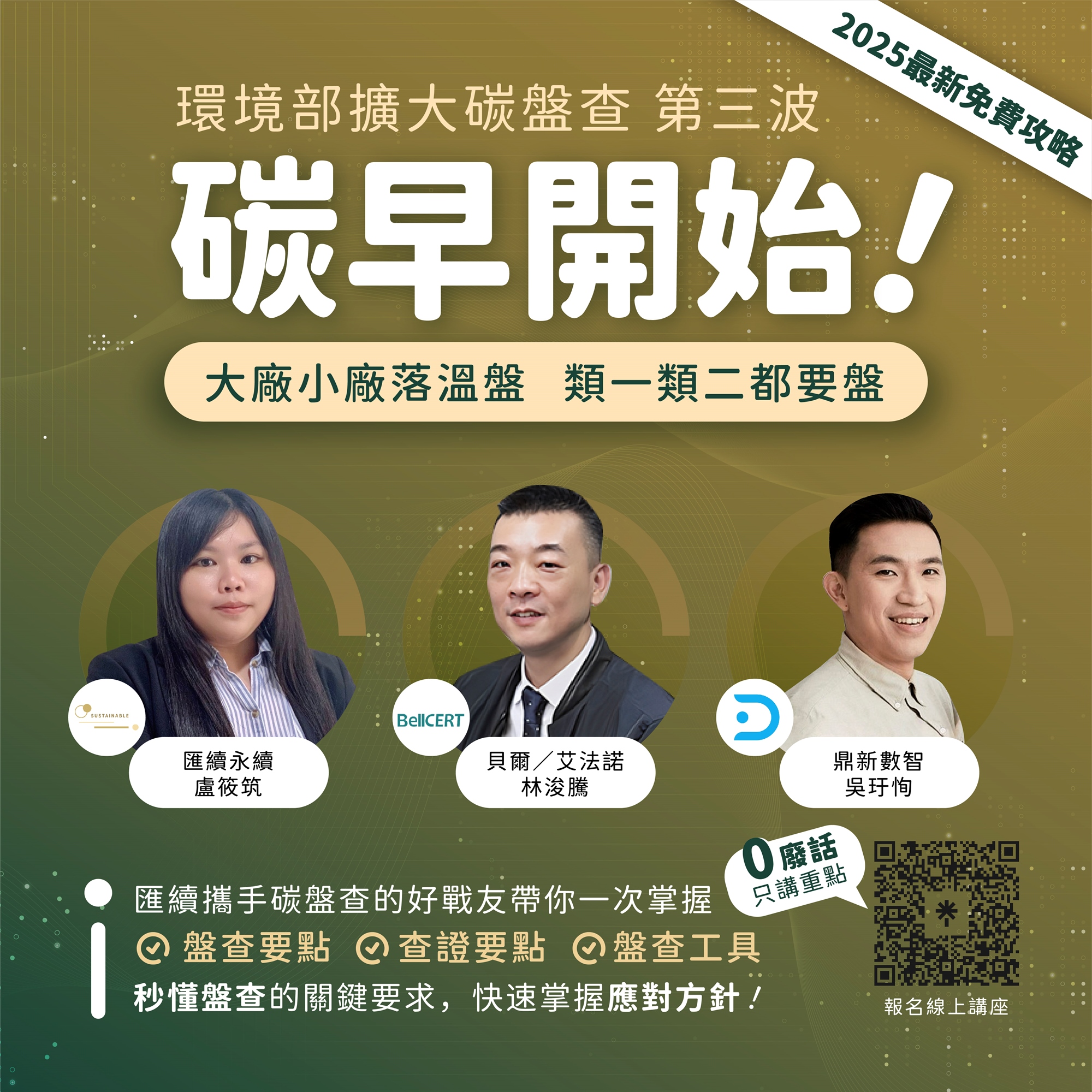 還沒開始執行溫室氣體盤查的企業朋友們,”碳早”手刀按下報名!免費的線上課程,用短短60分鐘的時間將所有的『盤查要點、查證要點及推薦的數位工具』一次由資深顧問用『聽得懂的話』將政策要求、作業流程告訴你,並提供最實用的減碳策略建議,一次將精華濃縮在這堂課中!