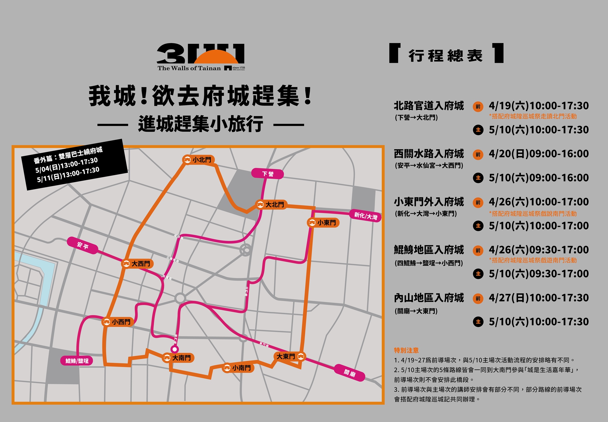 - 5/10的5條路線皆會結合「城是生活嘉年華」活動,一同到大南門城參與活動,前導場次則不會安排此橋段。