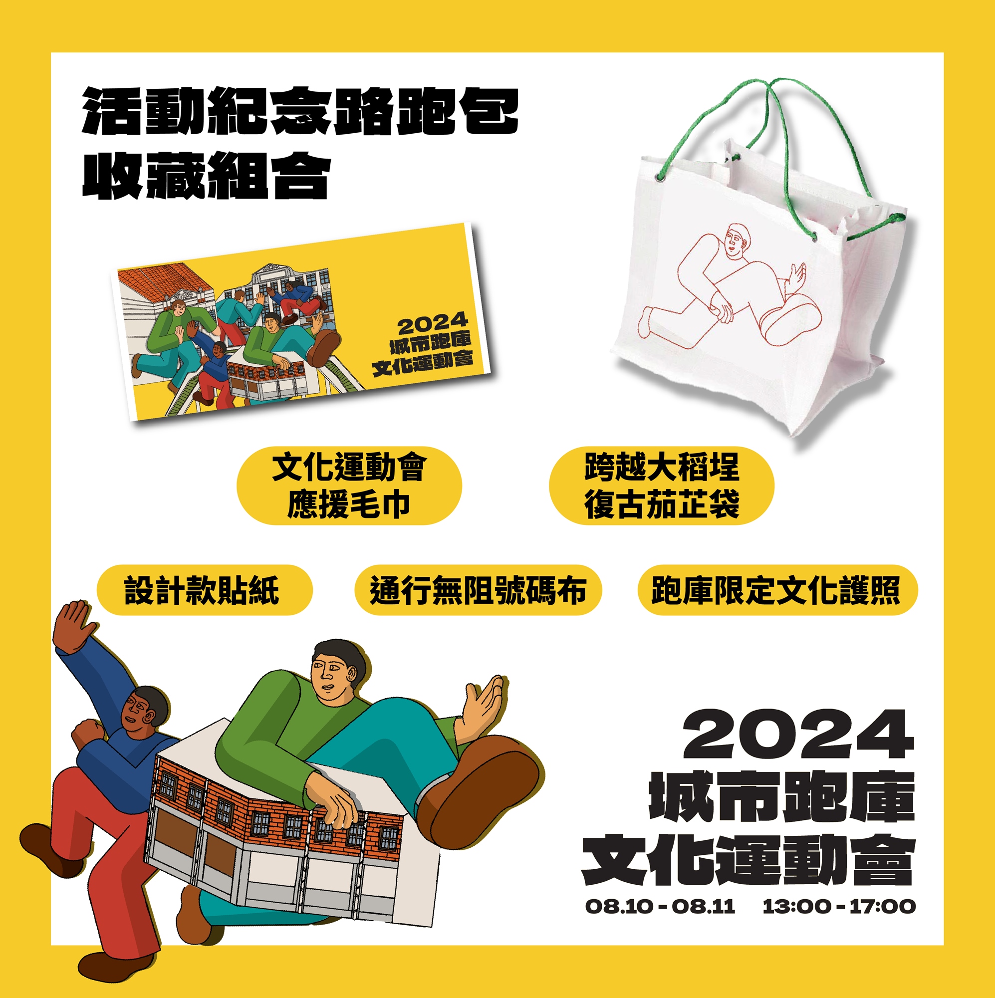 本活動為免費參與,特別為早鳥報名者推出「早鳥限定!活動紀念路跑包收藏組合」,每組限定價 400 元,由新銳設計師 Poan Pan 設計,內含「文化運動會應援毛巾」、「跨越大稻埕復古茄芷袋」、「設計款貼紙」(不拆售)。早鳥報名者將優先取得「跑庫限定文化護照」與「通行無阻號碼布」,保留參與文化運動會的資格。視盟會員再享 100 元折扣,把握機會,立即訂購!