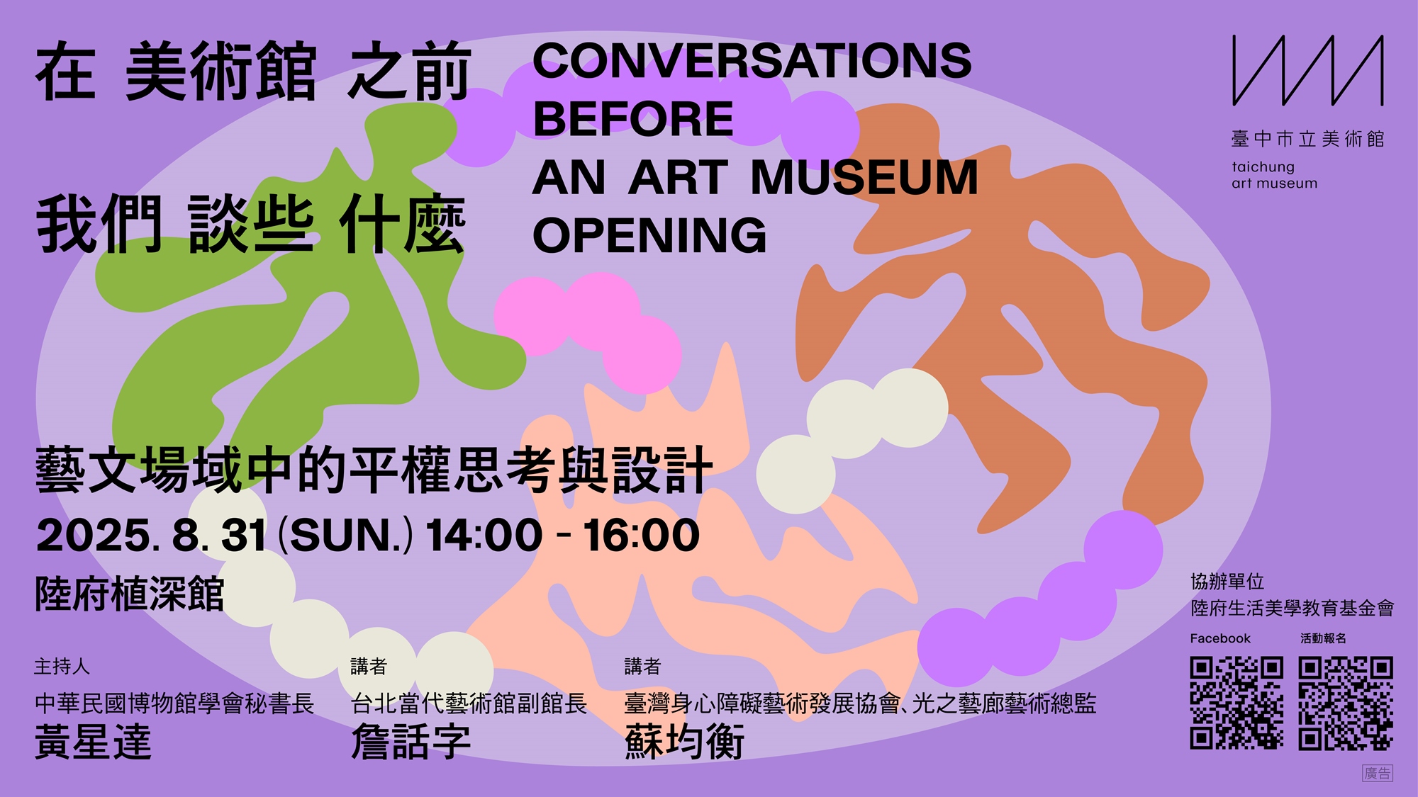 臺灣目前的博物館無障礙近用性服務,是否真的能夠充分回應身心障礙者的多元需求? 我們該如何從不同近用族群的角度出發,打造真正包容、友善的藝文環境?而在臺中,在地藝文組織又是如何推動身心障礙藝術的發展與實踐?本場次特別邀請台北當代藝術館副館長詹話字,以及臺灣身心障礙藝術發展協會、光之藝廊總監蘇均衡,分別從美術館與在地經驗的雙重視角,分享推動文化平權的經驗與案例。從展覽、活動到空間規劃,兩位講者將帶領我們深入思考,如何更全面地推動友善的藝文環境,進一步實踐藝術場域中的共融與平權。