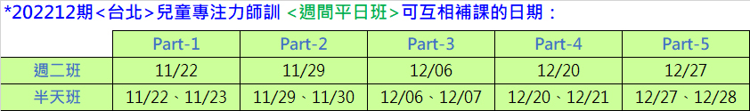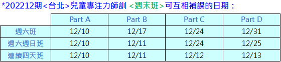 *報名各班的學員如果有某天因事不能上課,可請假到別班補課 (例如PartC的日期 12/12, 12/24 進度一樣, 可以互相補課, 但順序要PartA排第一天、Part-1排第一天)。