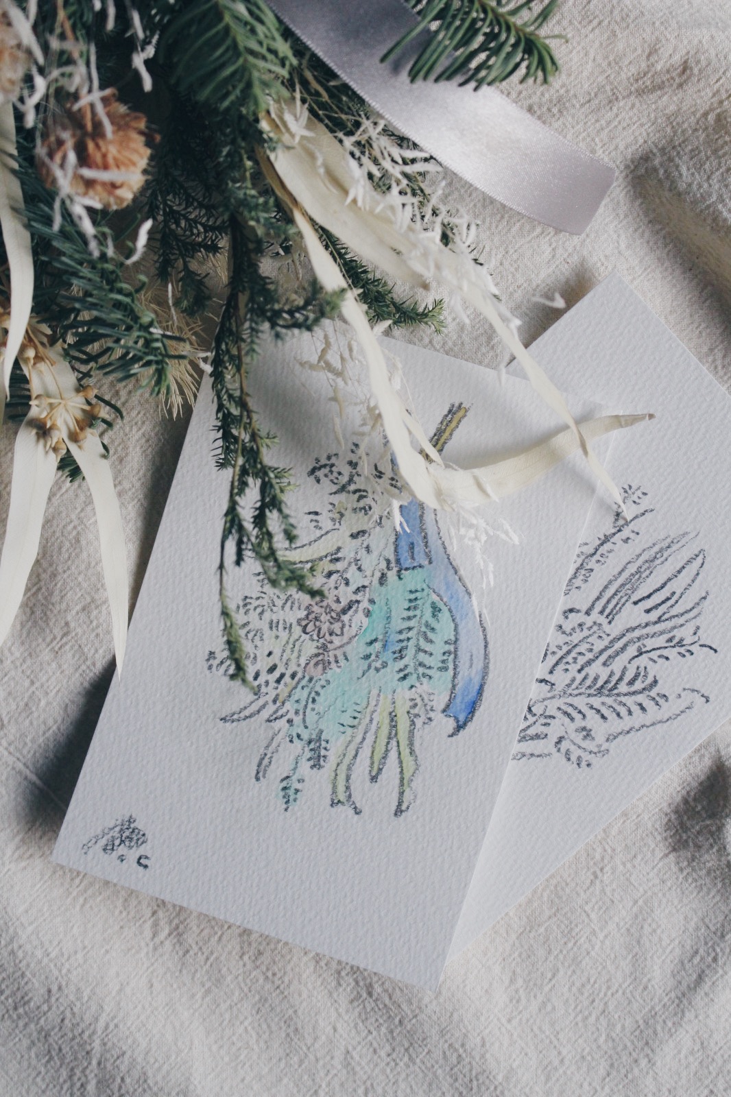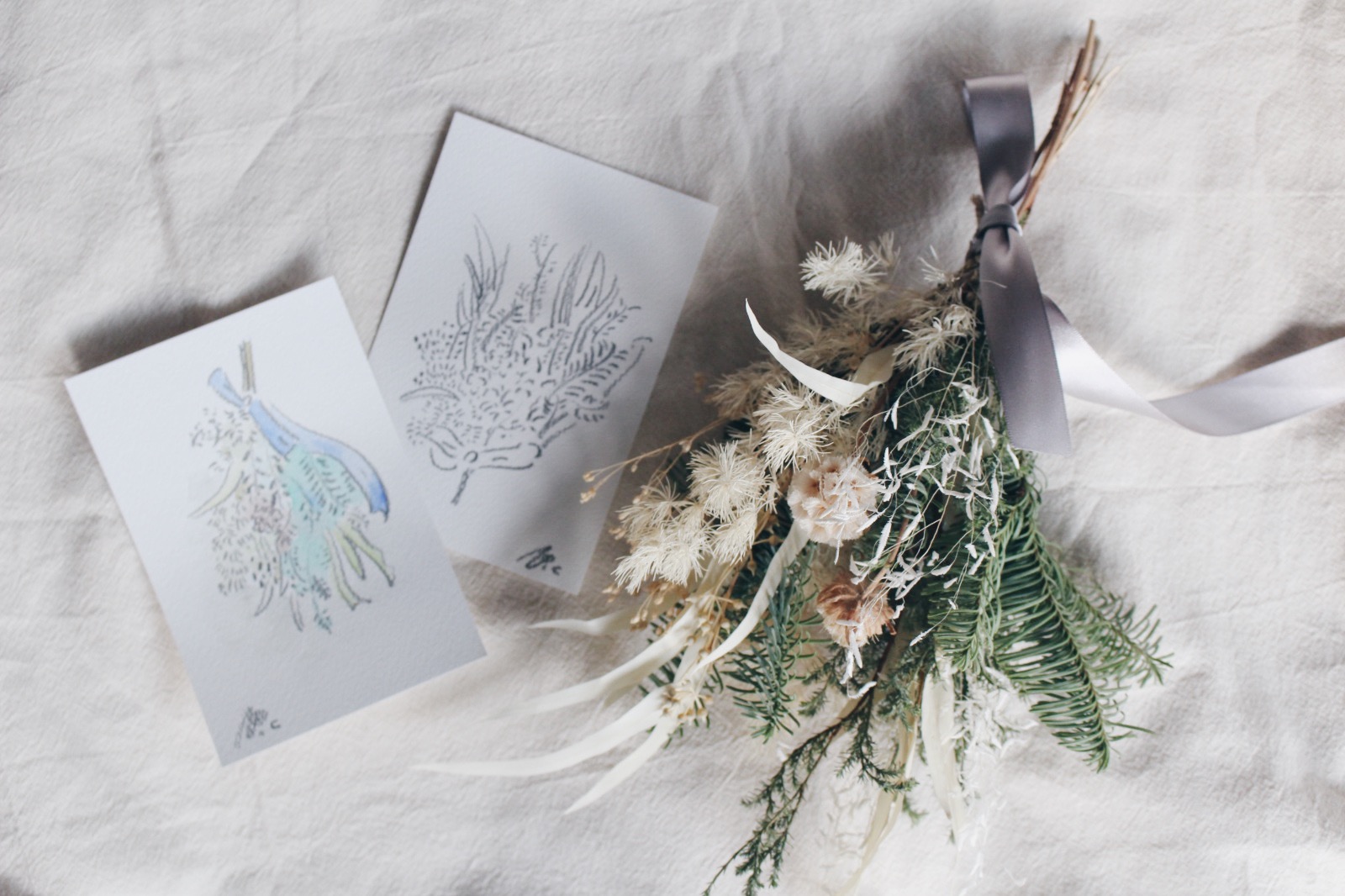 因應這次展覽主題與回憶和旅行有關,所以希望在展場營造出⼀種好像置身某個他方,卻像在夢中情境的氛圍。今年聖誕節,不只是圖書館邀請 TFC 團隊帶領學員們進⾏聖誕吊掛花創作,接著由創作者徐世賢進行第二階段的速寫教學,帶領學員將畫作小卡和花藝作品合為一體,創作屬於自己的獨一無而畫/花作,展期間與設計師共同展出圖書館!