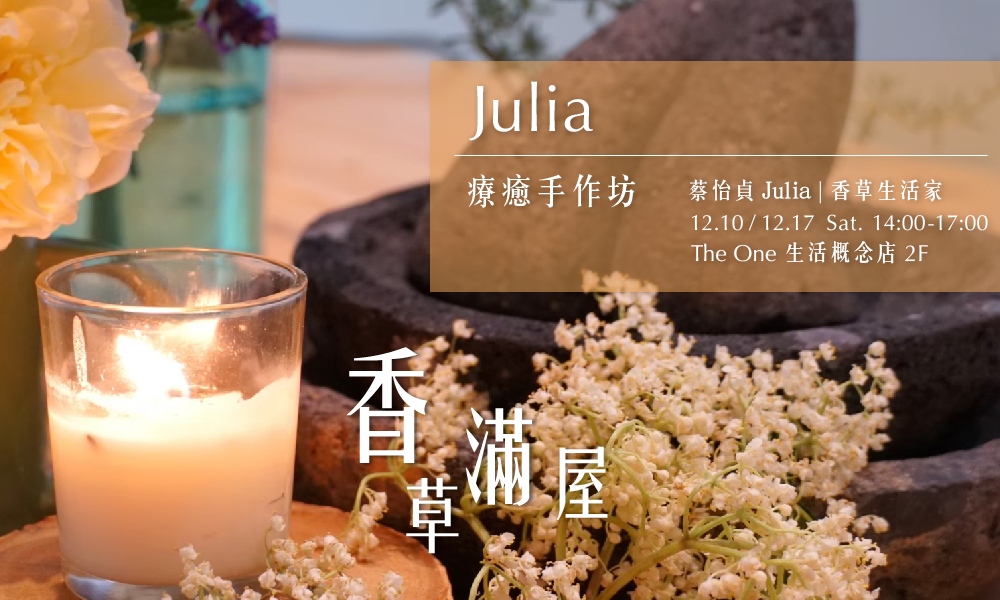 香草(料)因應季節更迭展現不同脈胳層次,秋冬之後,萬物好似安靜下來,冬日淡淡的寧靜,等待歲末的相聚!三五好友相伴,循著Julia的足跡,一起來The One敞開五感!體驗療癒的香草力,點燃一室馨香入冬,感受冬日的溫暖氣息。