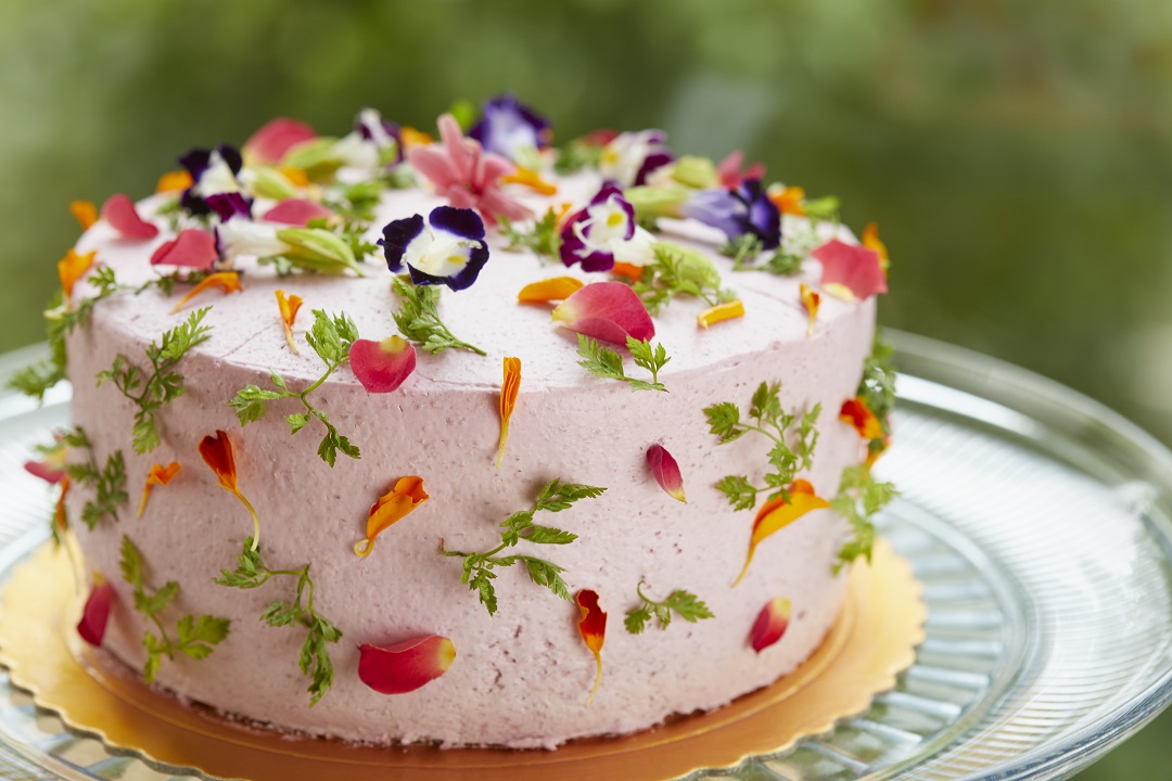 三公分的火龍果內餡可是不易堆疊,薄片密密層層,有別於傳統蛋糕上膩口的奶油,混和柳橙、胡蘿蔔的粉膚色奶油加入豆乳起司,口感滑順綿軟,斑斕的食用花草為外觀綴飾,這兼容視覺、味覺的響宴由裡而外皆取之於自然。