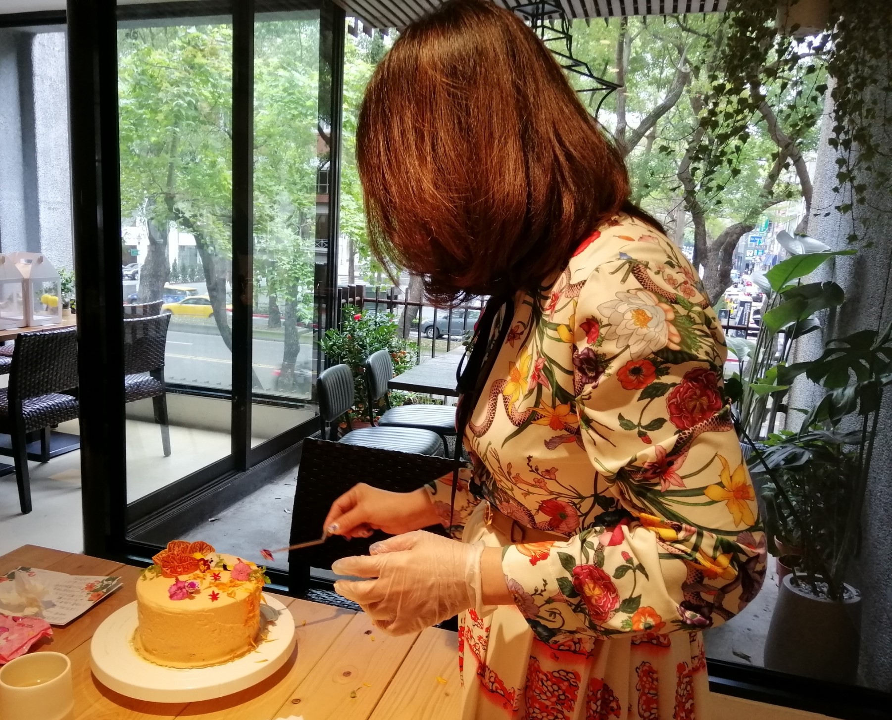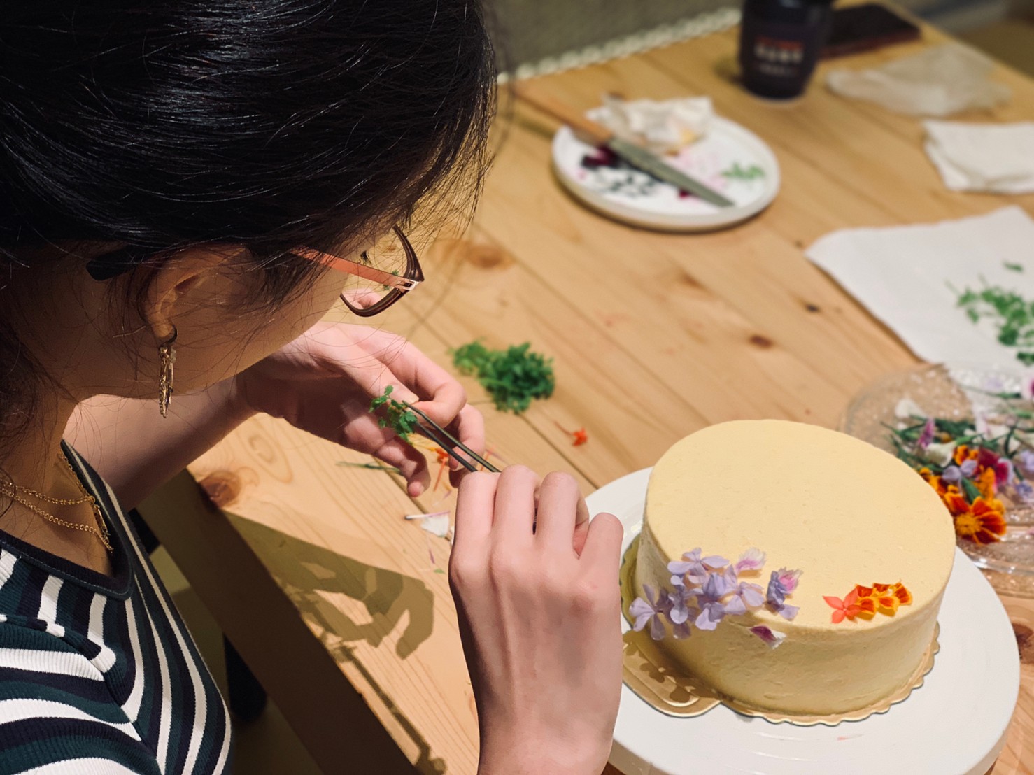 2.學員經由主廚指導完成火龍果內餡堆疊,並於外層抹上蔬果鮮奶油霜至整顆蛋糕完整,學員以食用花自由創作裝飾蔬果蛋糕。