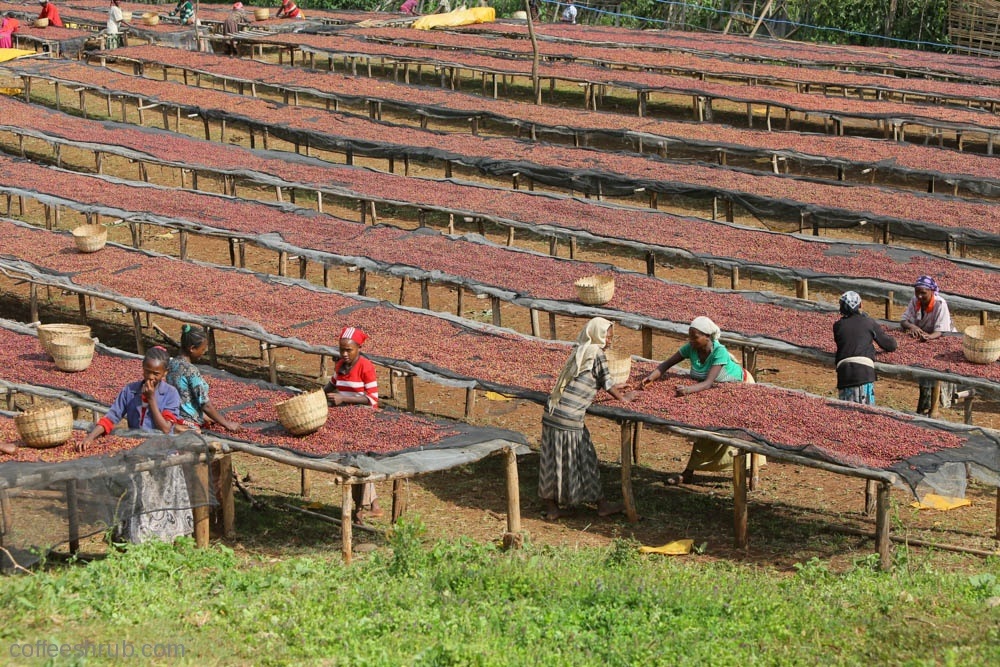 當地咖啡生產來源幾乎都屬於個體性的小農形態,產季到來時摘採自家鄰近的完熟的紅透漿果送至處理廠,放置在通風良好的非洲棚架上控制溫度與發酵程度,去除果肉後再將含水量降低至11.5%-12%之間,當後製處理與靜置作業完成後,再透過ECX衣索比亞商品交易所的競標體系做出口