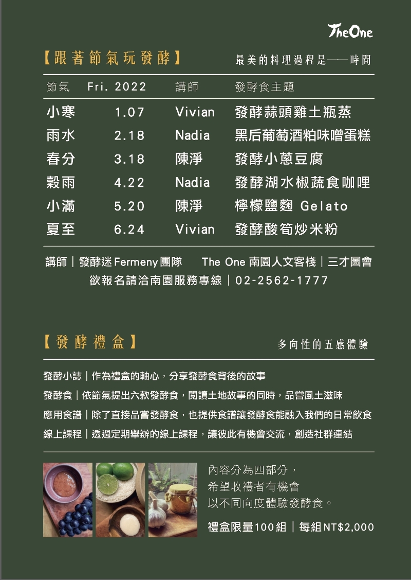 為傳遞台灣各領域職人精神,以及還原塵封的台灣古早人文精神、文化記憶,【甕裡的月亮】釀漬發酵食展於12月15日至2022年6月30日於The One南園人文客棧盛大展出,特別邀請「發酵迷Fermeny」黃靖雅老師,針對其釀漬發酵的技術專業與美感藝術,蒞臨南園東廂房策展。