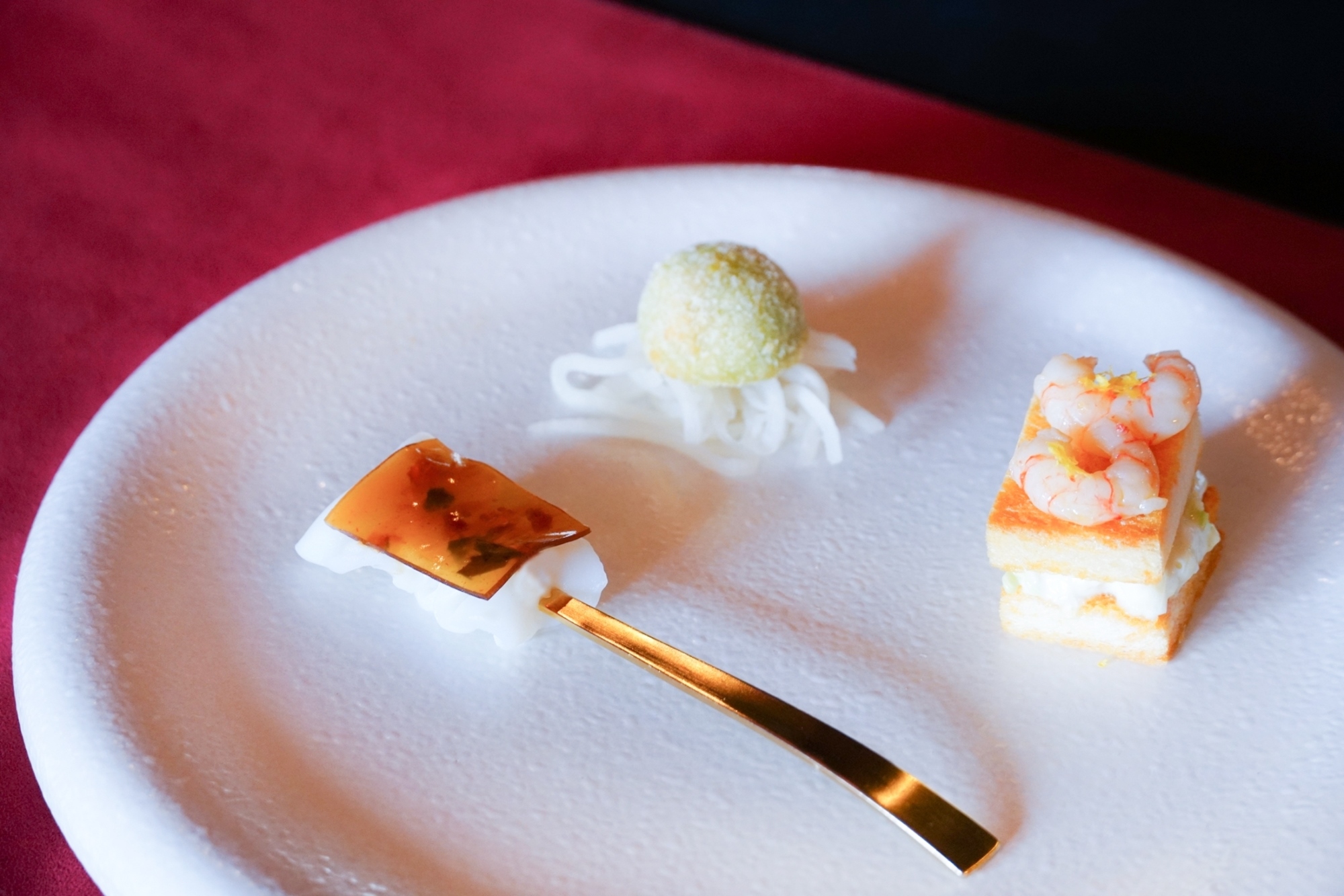 前菜│紅劍蝦三明治+五味晶凍軟絲+甜豆泥起司球佐漬菜