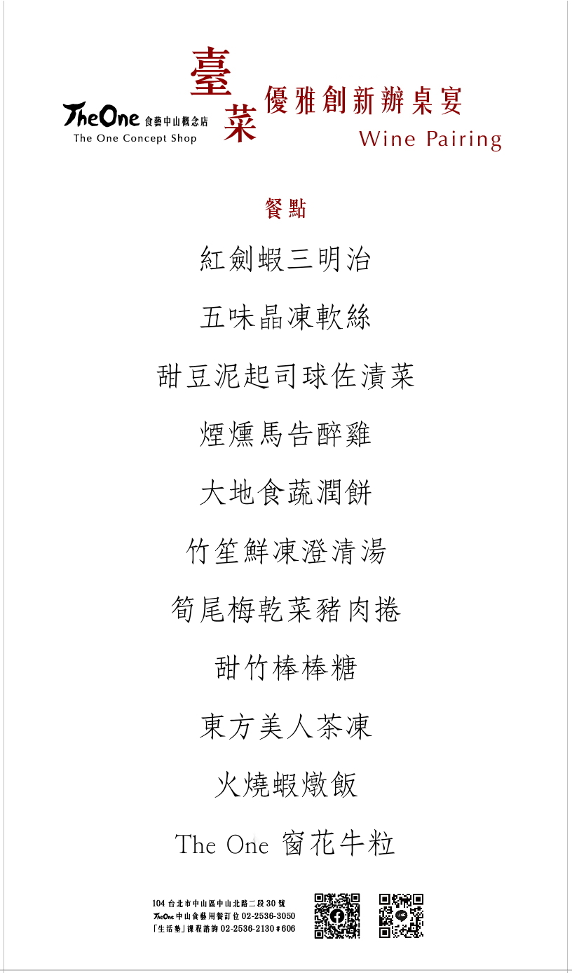 The One 食藝團隊 , 在簡天才老師及徐仲顧問的指導下 , 將經典臺菜解構再建構,保留傳統元素,加入創新思維,以法式手法翻轉而成「臺菜優雅創新辦桌」!