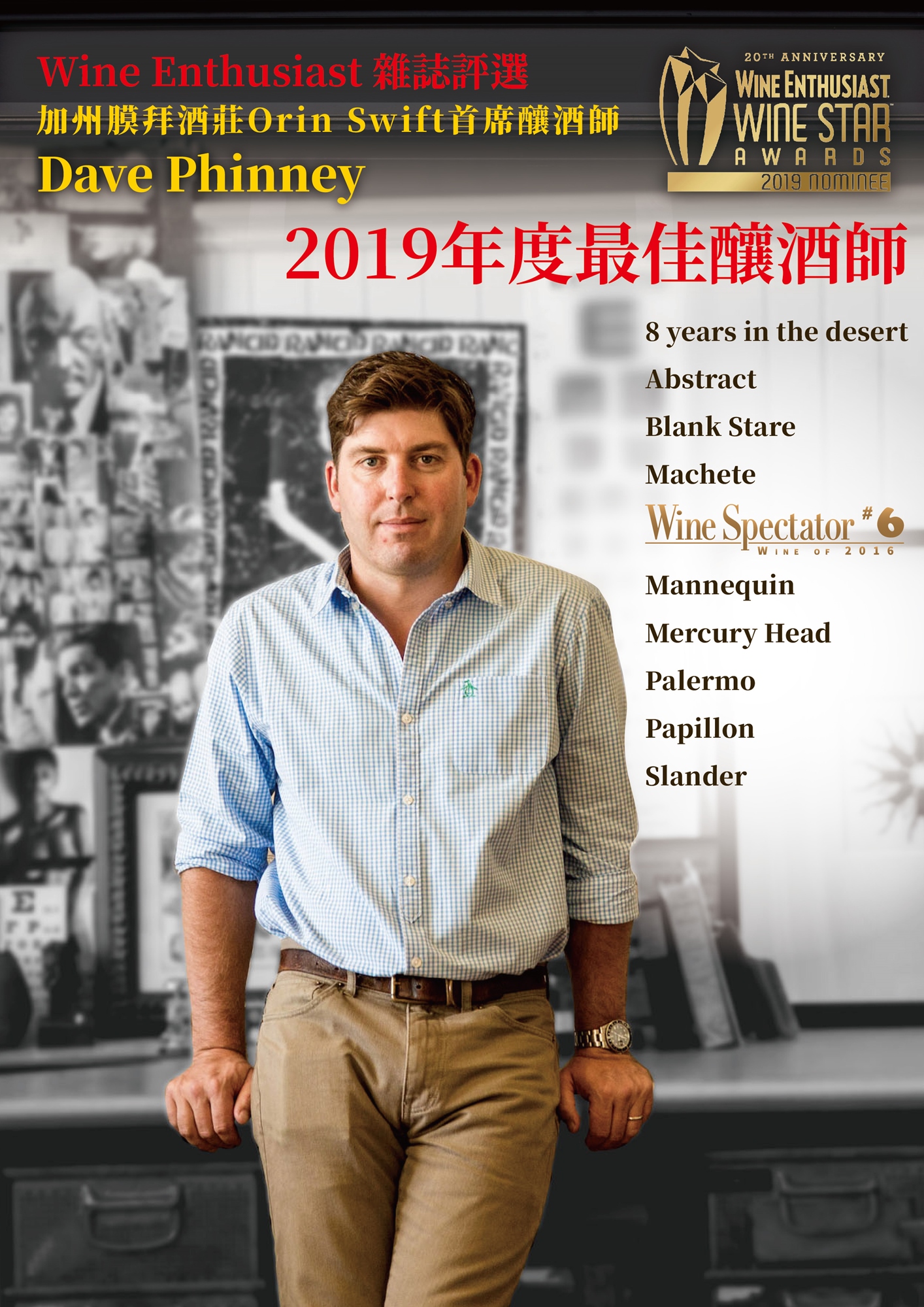 Wine Enthusiast “2019 年度風雲釀酒師”Dave Phinney 於1995年遊學義大利而深深愛上葡萄酒,1997 年隻身前往Napa Valley,寄出了無數封求職信,幸運地「只」獲得 Robert Mondavi 的回音…… 這段經驗對Dave有很深遠的影響,不久之後他創立了自己的酒莊Orin Swift,以父親的中間名Orin 和母親的姓氏Swift命名。Dave 的葡萄酒事業因而蒸蒸日上,獲得酒界巨擘 E&J Gallo Winery 青睞,並於 2016 年的年中將Orin Swift酒莊納入旗下。