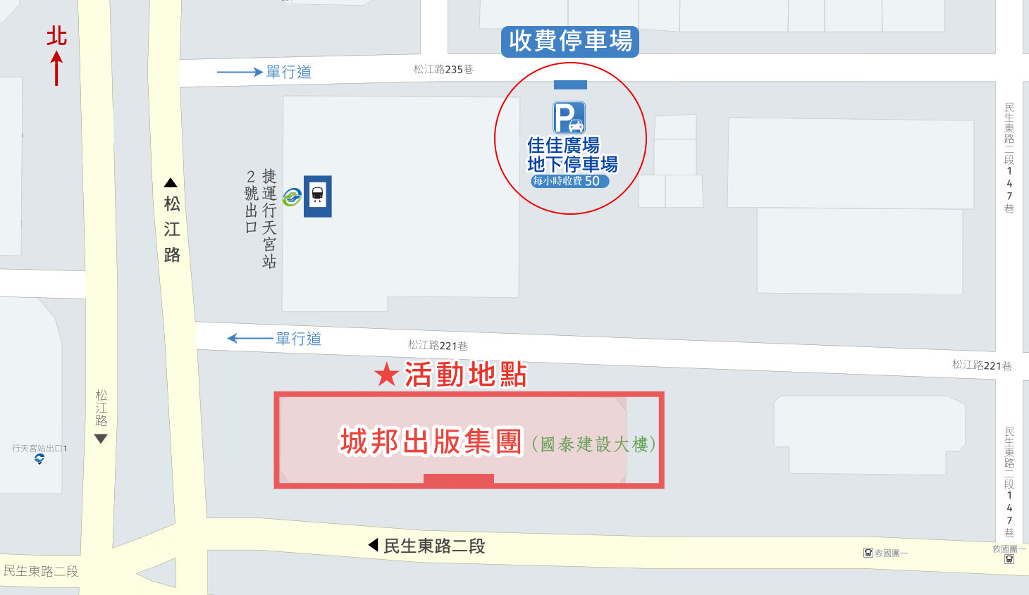 捷運行天宮站2號出口旁,國泰世華與城邦媒體白色大樓,一樓是國泰世華銀行。
