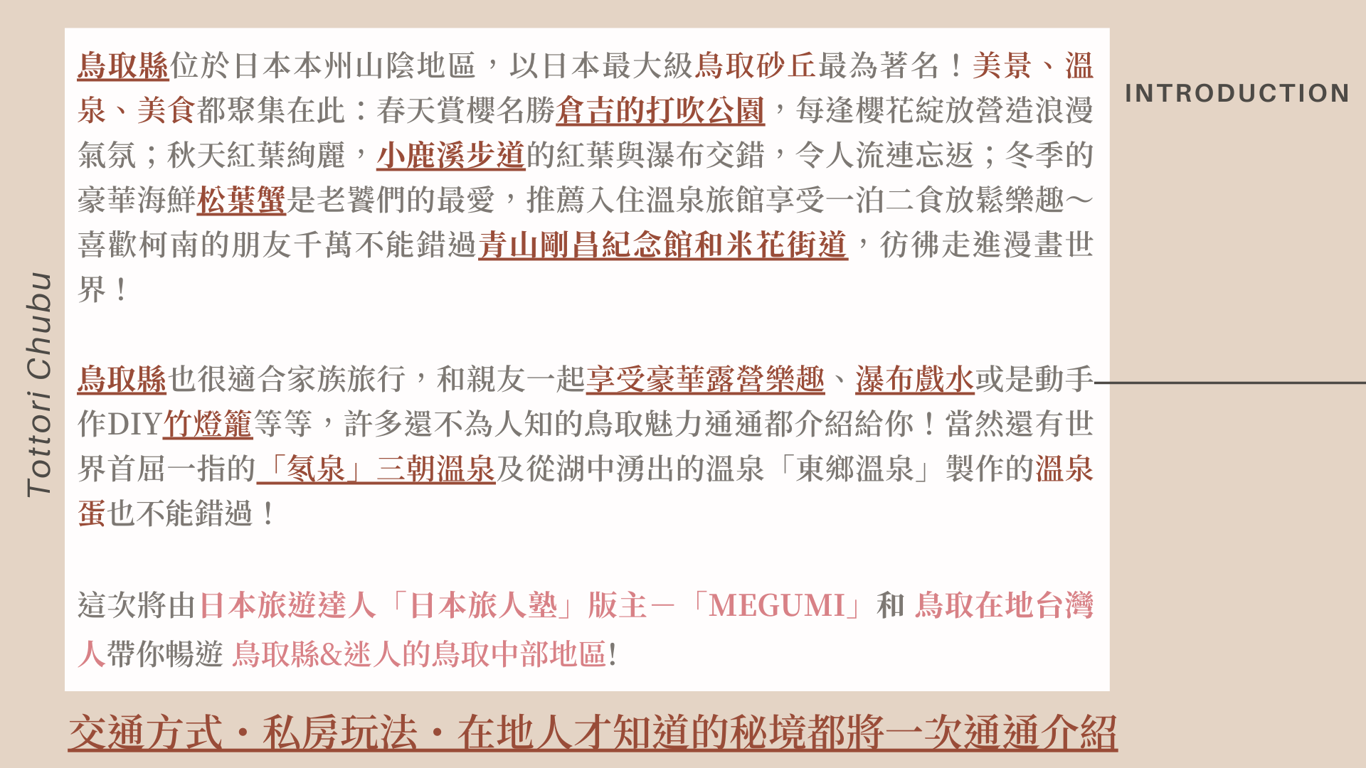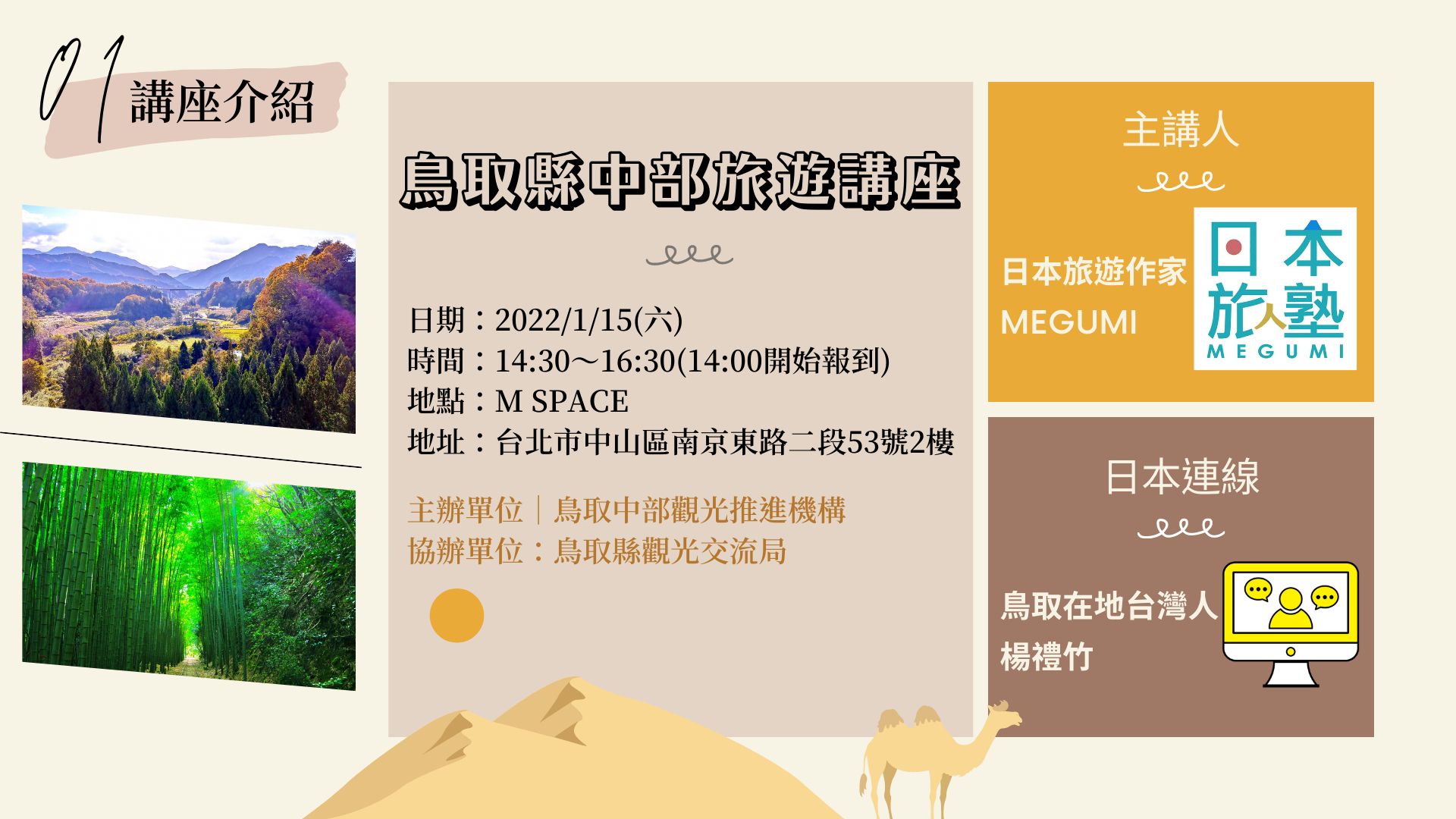 這次將由日本旅遊達人「日本旅人塾」版主-「MEGUMI」和 鳥取在地台灣人帶你暢遊 鳥取縣&迷人的鳥取中部地區!