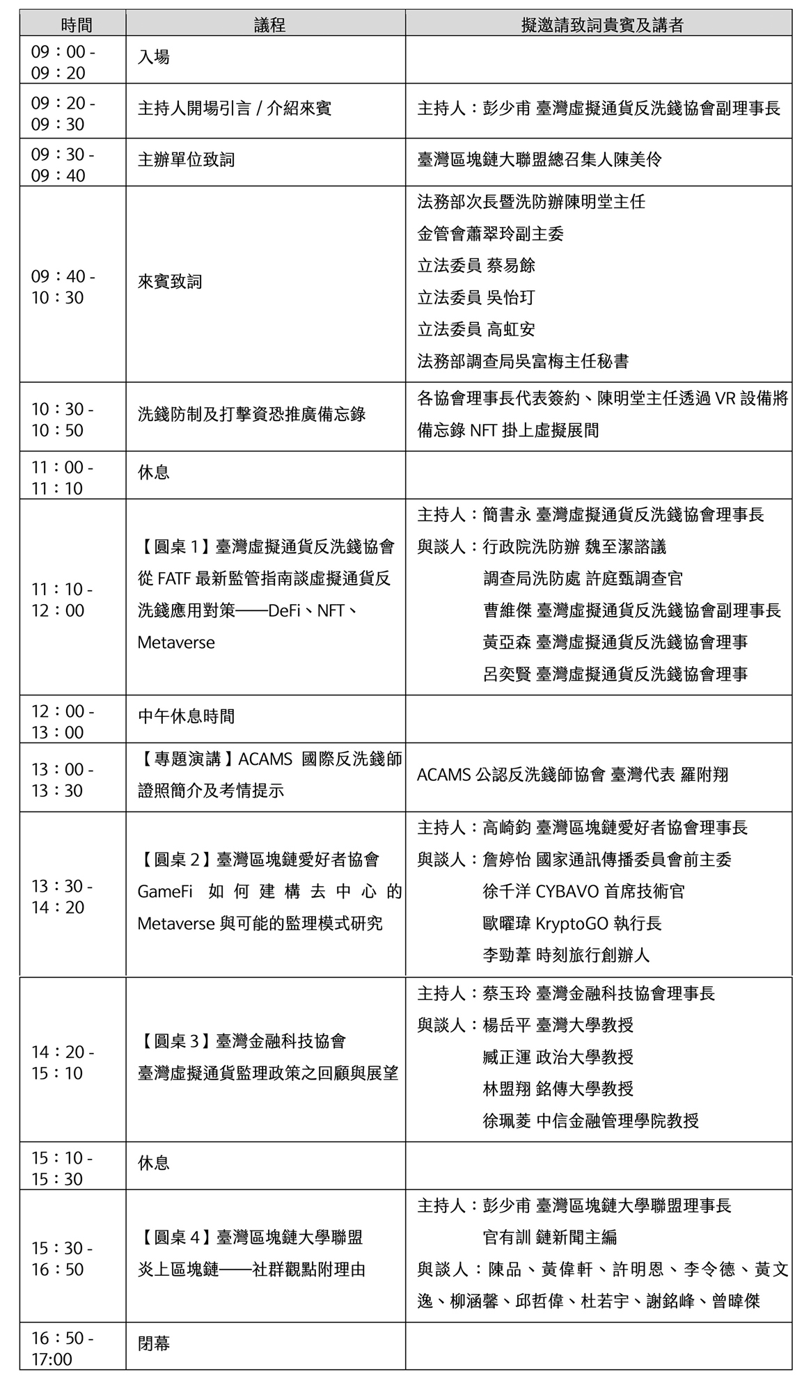 為增進台灣虛擬通貨平台及交易業務洗錢防制之重視,提升台灣虛擬通貨平台及交易業務監管之研究深度,並就近期創新科技發展重點諸如元宇宙(Metaverse)、非同質化代幣 (NFT)、去中心化金融(DeFi)、區塊鏈在地化等區塊鏈應用及監管議題,集結產、官、學各界專業人士交互探討。臺灣虛擬通貨反洗錢協會將於2022年初舉辦區塊鏈應用暨虛擬通貨反洗錢高峰論壇活動,讓所有愛好者追蹤區塊鏈產業動態。