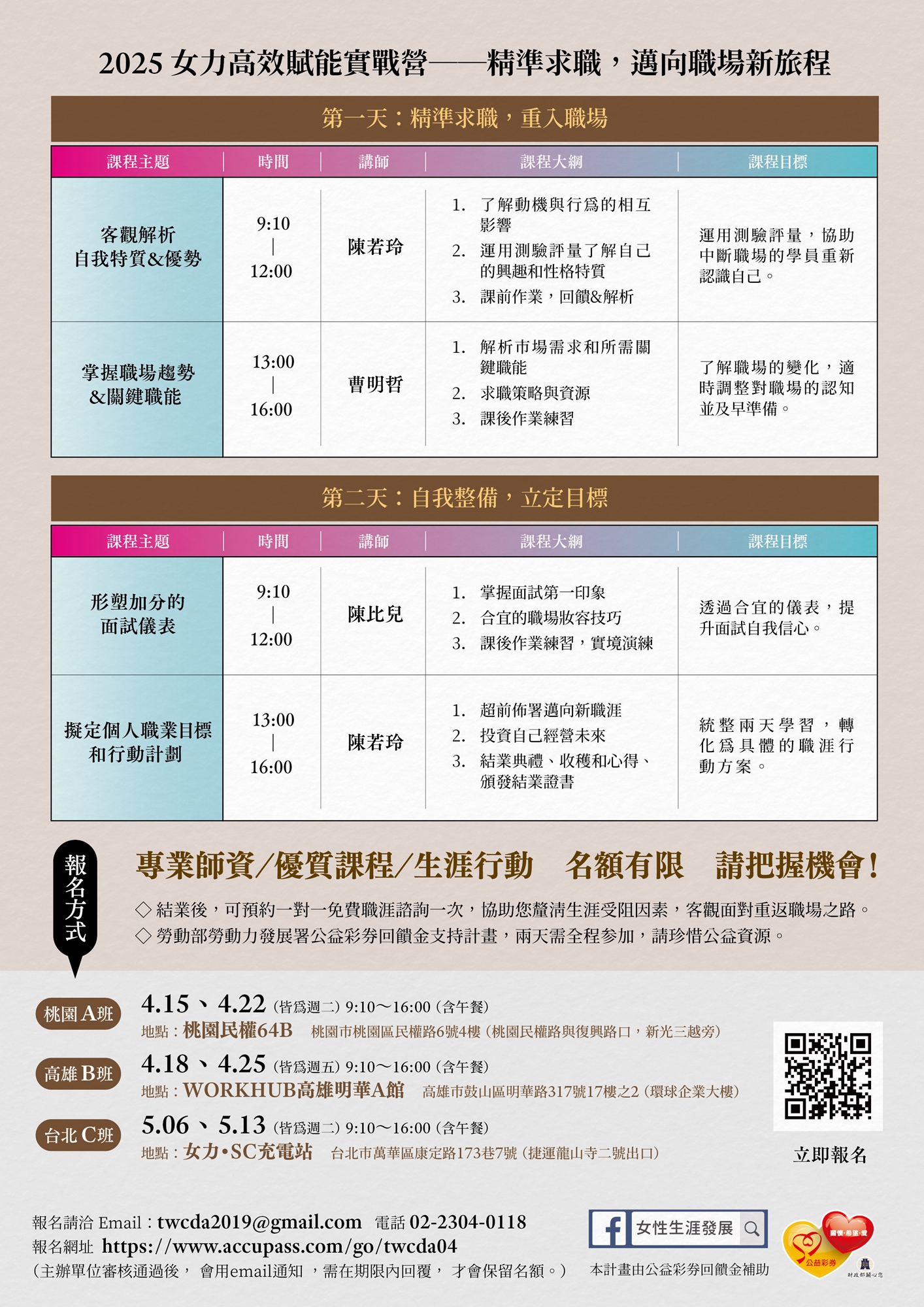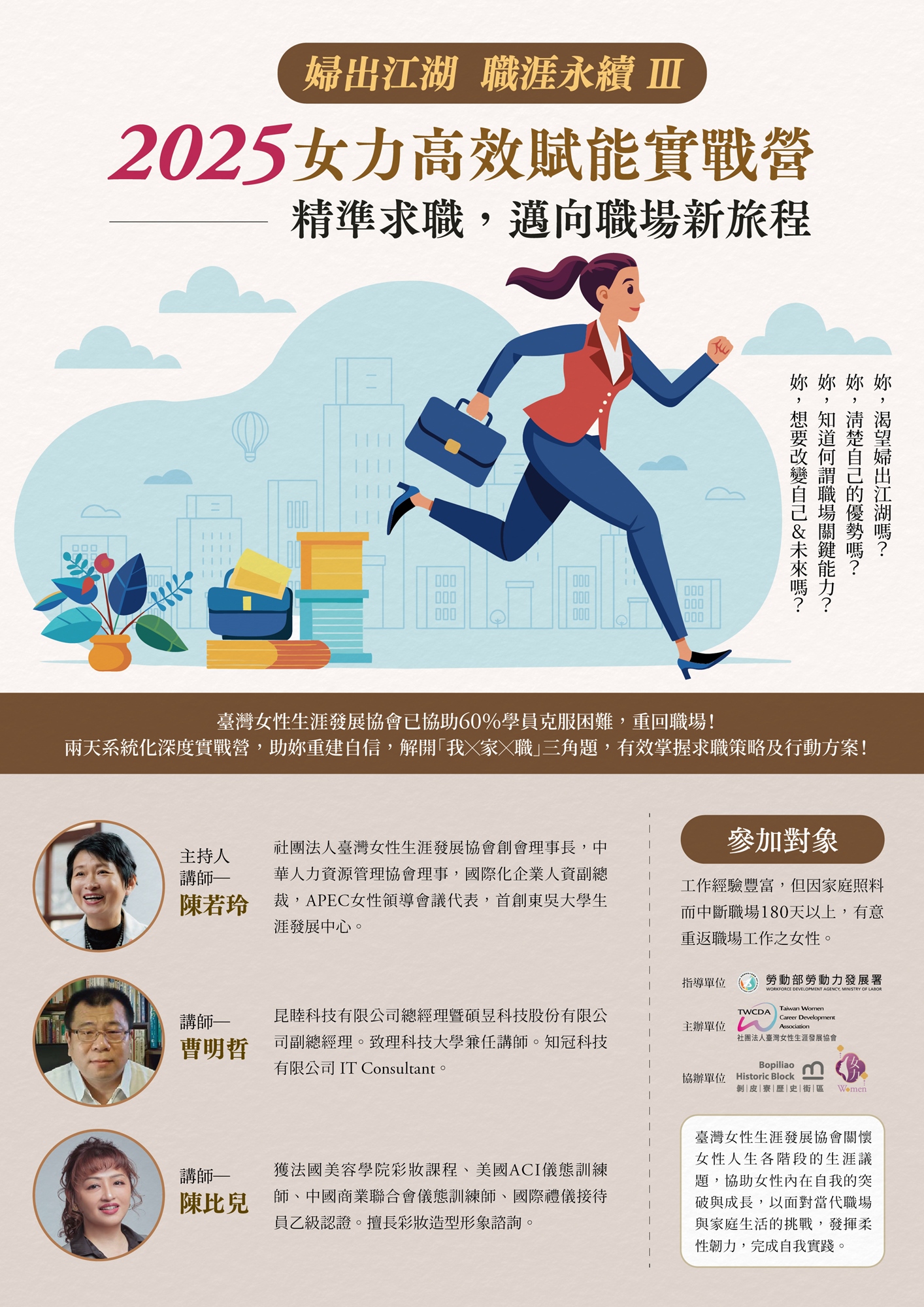 給自己兩天~重新啟動女性職涯,翻開人生新篇章!讓您重新站在職場的舞台上,掌握求職技巧、平衡家庭與工作,實現女性生涯發展的夢想!