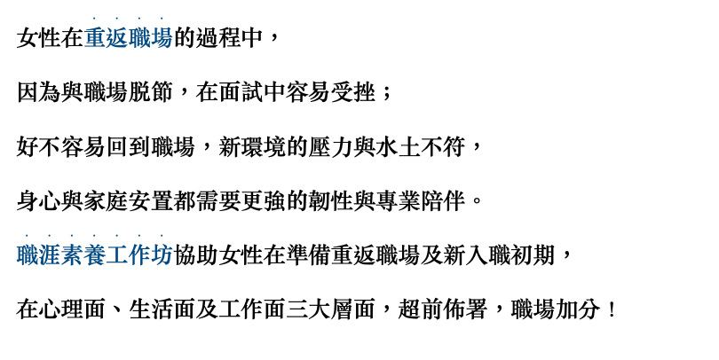 臺灣女性生涯發展協會關懷女性人生各階段的生涯議題,協助女性內在自我的突破與成長,以面對當代職場與家庭生活的挑戰,發揮柔性韌力,完成自我實踐。 |