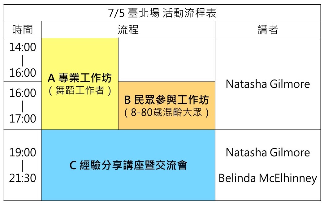 對象:一般大眾、藝文從業人員(舞蹈藝術工作者、藝術行政和管理者、社福機構和社區營造藝文活動企劃者等)