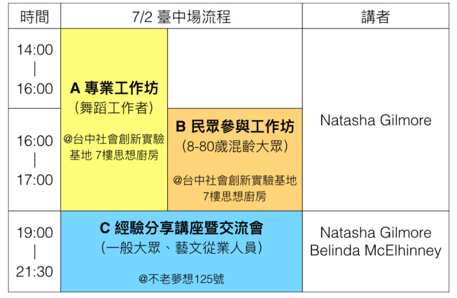 對象:一般大眾、藝文從業人員(舞蹈藝術工作者、藝術行政和管理者、社福機構和社區營造藝文活動企劃者等)