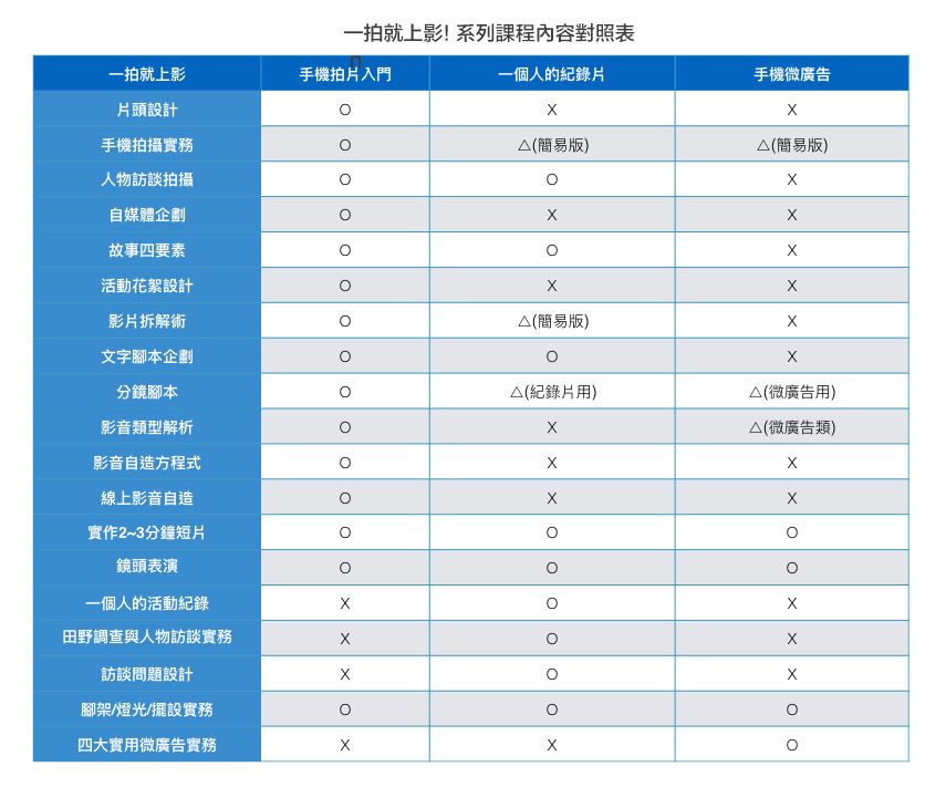A:因為手機拍片入門班是最基本,最全面性的新手入門班,針對影音客或欲用自媒體內容產生影響力者,課程前身是「超級影響力」原本設定是給獨立的影音自媒體人學習的,所以入門班會帶到「目前」所有入門新手最常用的影音自造技術與基本功,獨家才有「自媒體企劃」,「活動花絮」,「直播」,「個人片頭製作」章節,較適合想要全面性入門拍攝+應用面廣泛的影音客或影音自造者。建議最好修過這門課,再進修一個人的紀錄片或微廣告班,收穫會更多。