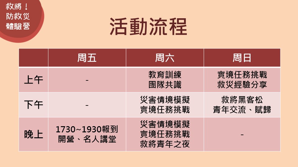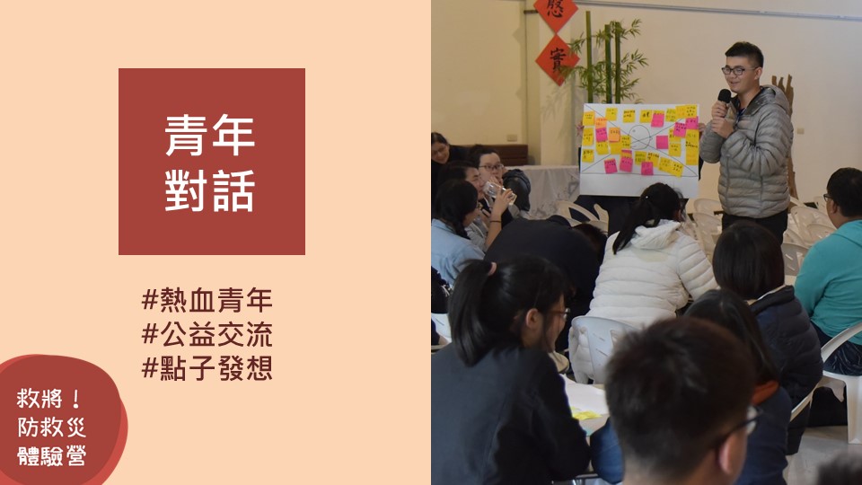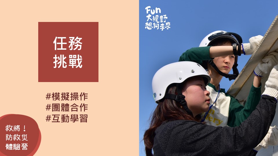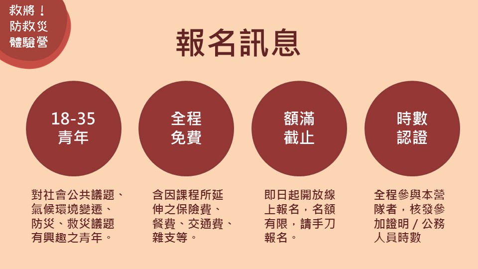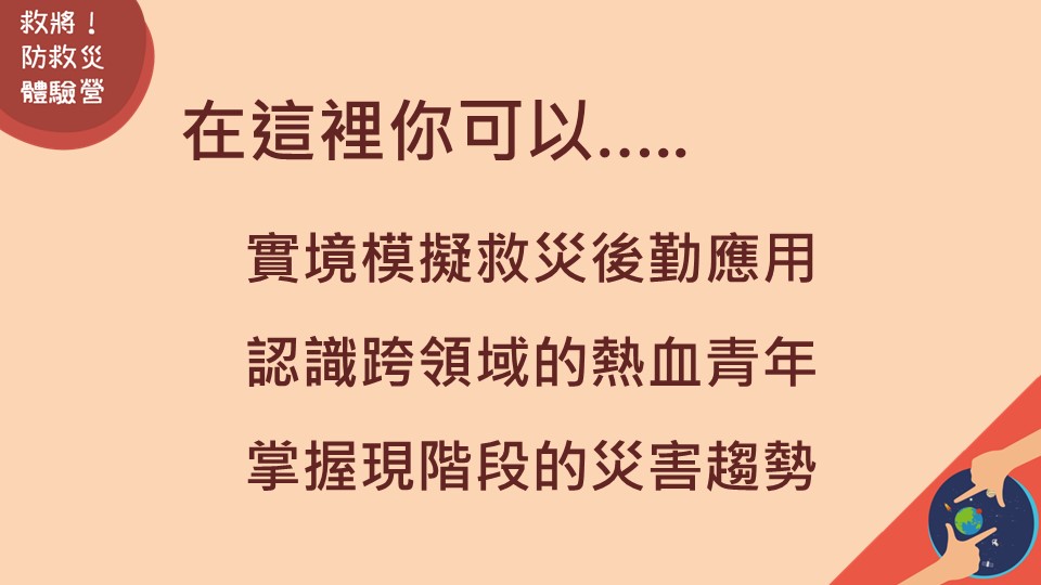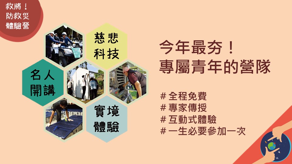 曾幾何時?面對災害--已經成為臺灣社會重要的議題!!!!如果你面對著電視、電腦螢幕心中有一份悸動如果你想投入災害相關工作,卻不知管道在哪裡?邀約有志於投入災害援助工作的「救將」,透過災援相關領域專家和專業團隊的分享,以及防救災模擬體驗,凝聚網路世代對災害的共識與行動,共同創造--救將!就是不一YOUNG!!