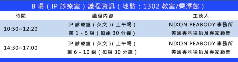A場(演講):國際會議廳 | B場(IP診療室):1302教室