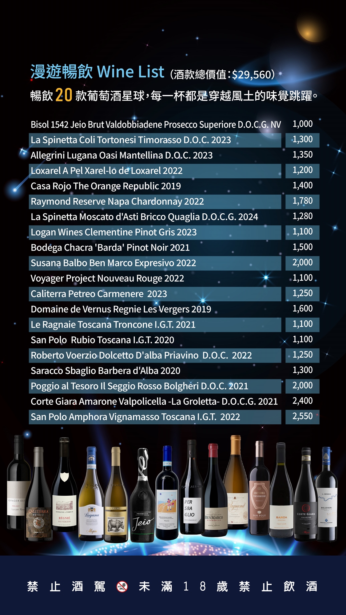 漫遊暢飲票:$1,699/人(暢飲 20 款 + 起司盤)