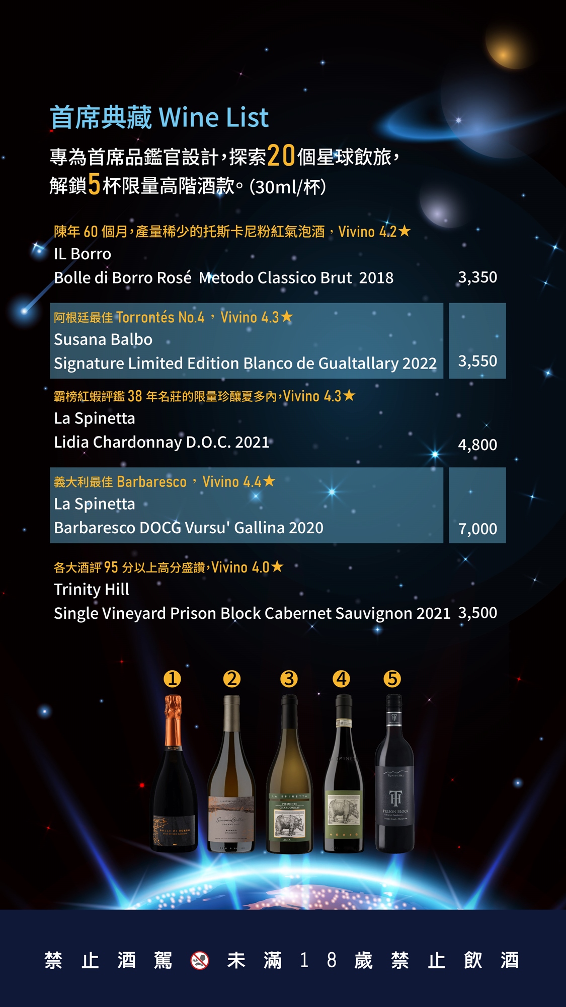 ・購買首席典藏票者,加碼5杯高階限量酒款(30ml/杯)。