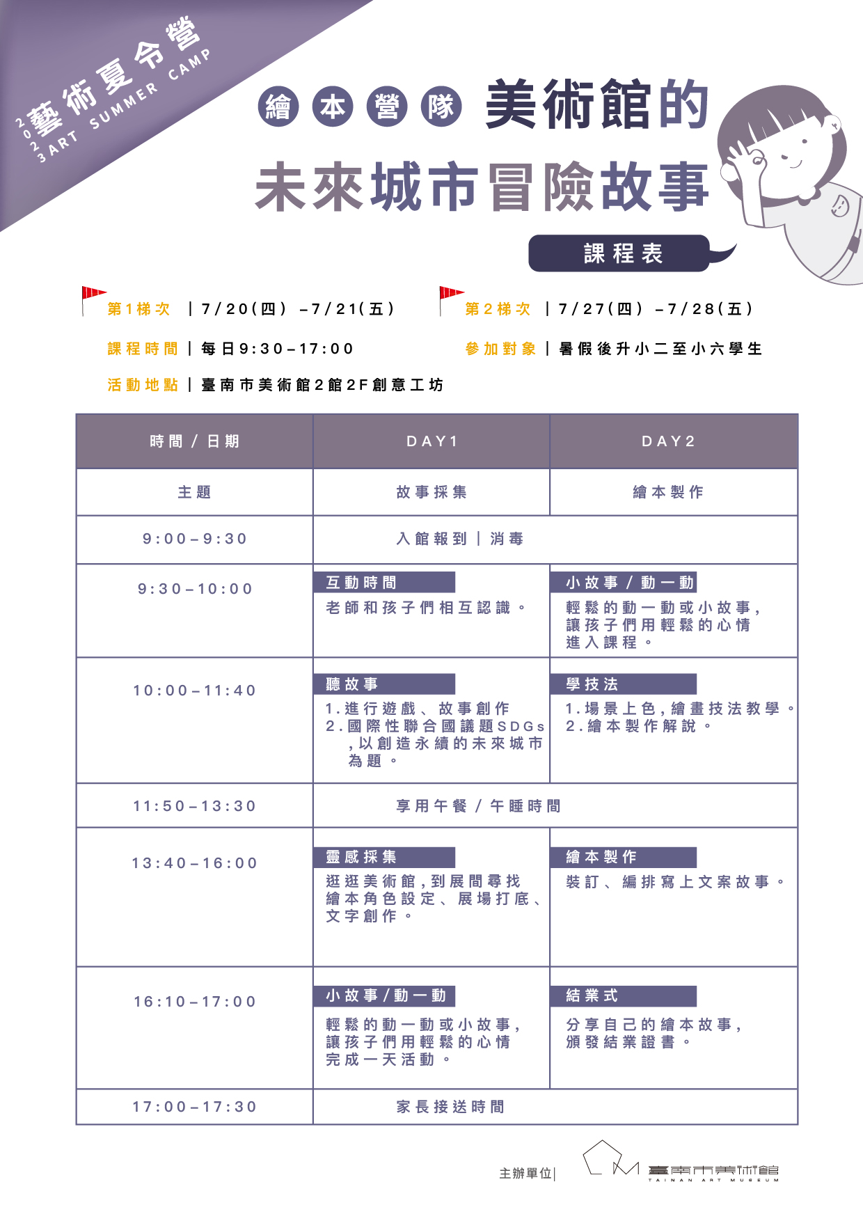 本次繪本營隊以〈未來城市冒險故事〉為題,帶孩子創造未來城市!從美術館的展覽中,看見台南400過去與現在的都市發展,並帶孩子們從SDGs的議題思考未來城市的發展。並創造出屬於自己的未來城市繪本故事,一起來美術館展開冒險吧!