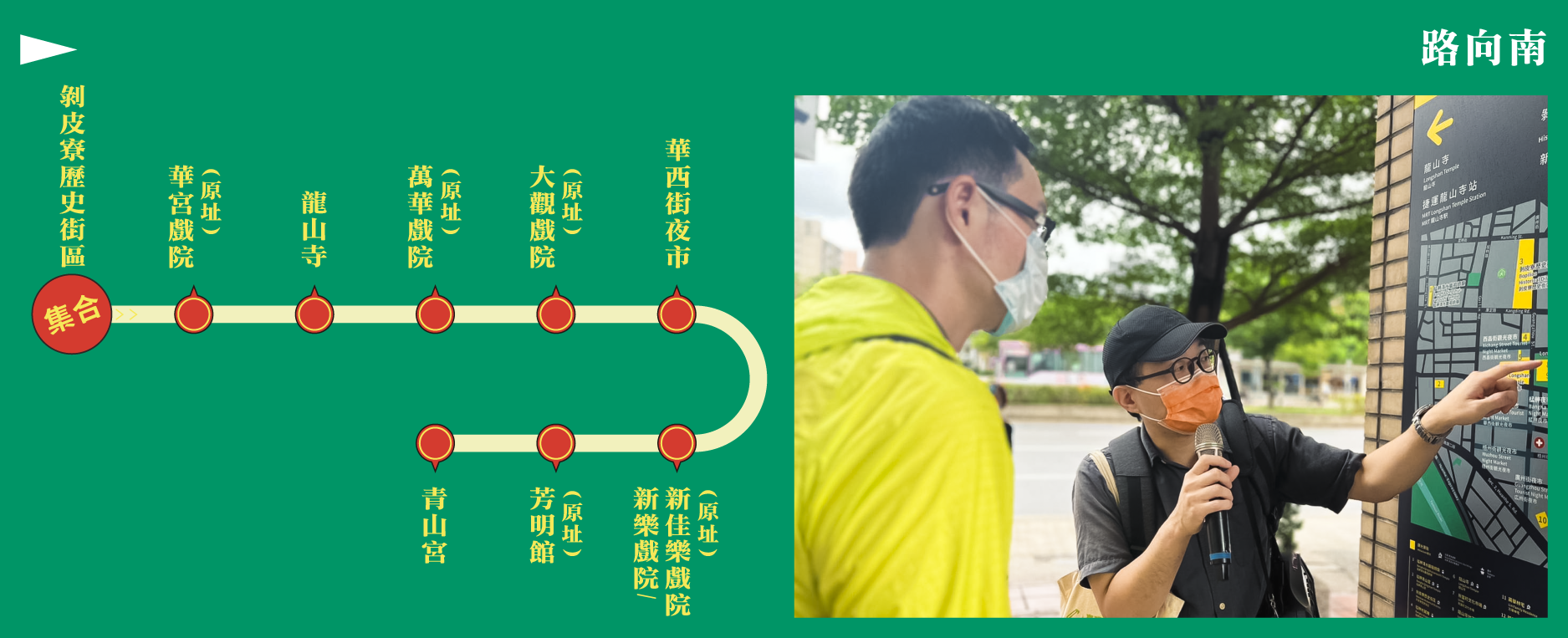 路線|剝皮寮歷史街區→華宮戲院(原址)→龍山寺→萬華戲院(原址)→大觀戲院(原址)→華西街夜市→新樂戲院/新佳樂戲院(原址)→芳明館(原址)→青山宮
