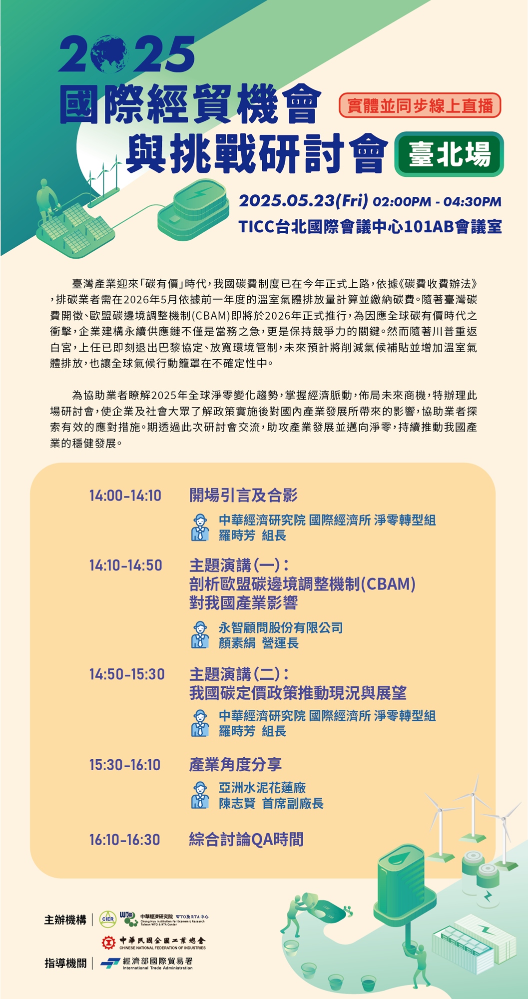 【個資同意書】中華經濟研究院向您蒐集之個人資料(包含個人姓名、公司名稱、職稱、電話及電子郵件地址等得以直接或間接識別個人的相關資訊),將僅限使用於本次研討會,期限自聯繫起始日至特定目的(指本次研討會/課程)終止日為止,並遵守「個人資料保護法」之規定妥善保護您的個人資訊,除蒐集之目的涉及國際業務、研究或活動外,本院僅於中華民國領域內使用。於此前提下,您同意本院得於法律許可之範圍內處理及利用相關資料以提供資訊或服務,但您仍得依法律規定之相關個人資訊權利主張如下事項:查詢、閱覽、複製、補充、更正、處理、利用及刪除,請以電子郵件向本院聯繫,